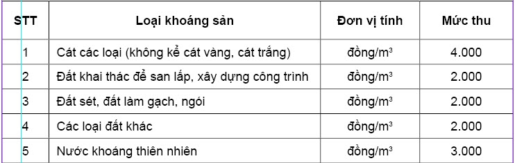 - Cát các loại (không kể cát vàng, cát trắng): Ngân sách cấp tỉnh hưởng 30%; ngân sách cấp huyện hưởng 50%; ngân sách cấp xã hưởng 20%.