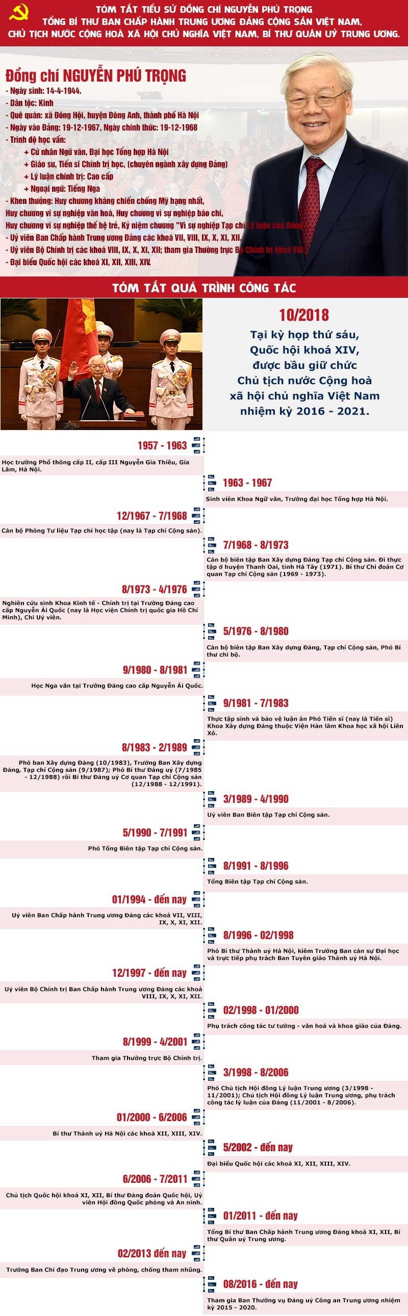 Ngày 23-10, tại Kỳ họp thứ sáu Quốc hội khóa XIV, đồng chí Nguyễn Phú Trọng, Tổng Bí thư Ban chấp hành Trung ương Đảng Cộng sản Việt Nam, đại biểu Quốc hội khóa XIV, đã được Quốc hội bầu giữ chức Chủ tịch nước Cộng hòa xã hội chủ nghĩa Việt Nam nhiệm kỳ 2016 - 2021.