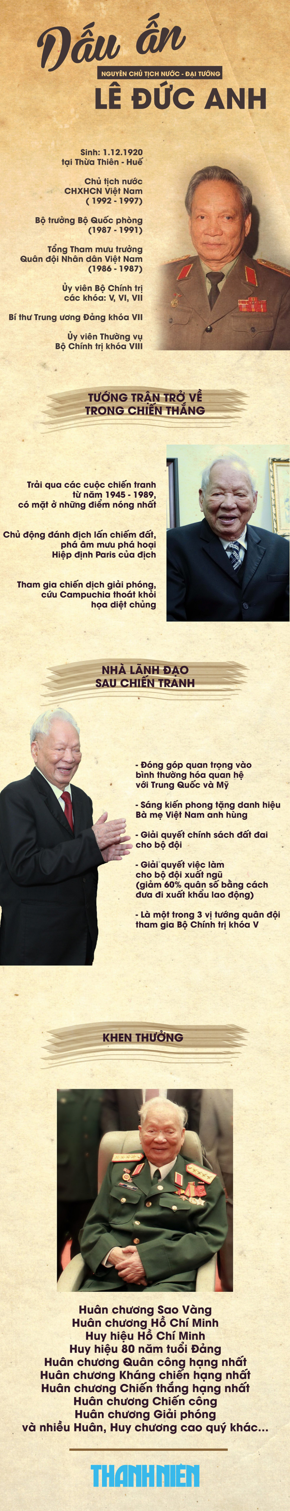 Đại tướng Lê Đức Anh giữ chức Chủ tịch nước nhiệm kỳ 1992 - 1997. Đại tướng Lê Đức Anh từng có mặt ở những điểm nóng nhất trong kháng chiến và trở về trong chiến thắng...