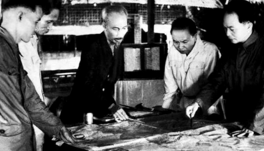 Chủ tịch Hồ Chí Minh, Đại tướng, Tổng Tư lệnh Võ Nguyên Giáp và các đồng chí trong Bộ Chỉ huy chiến dịch quyết định mở chiến dịch Điện Biên Phủ năm 1954. Ảnh tư liệu