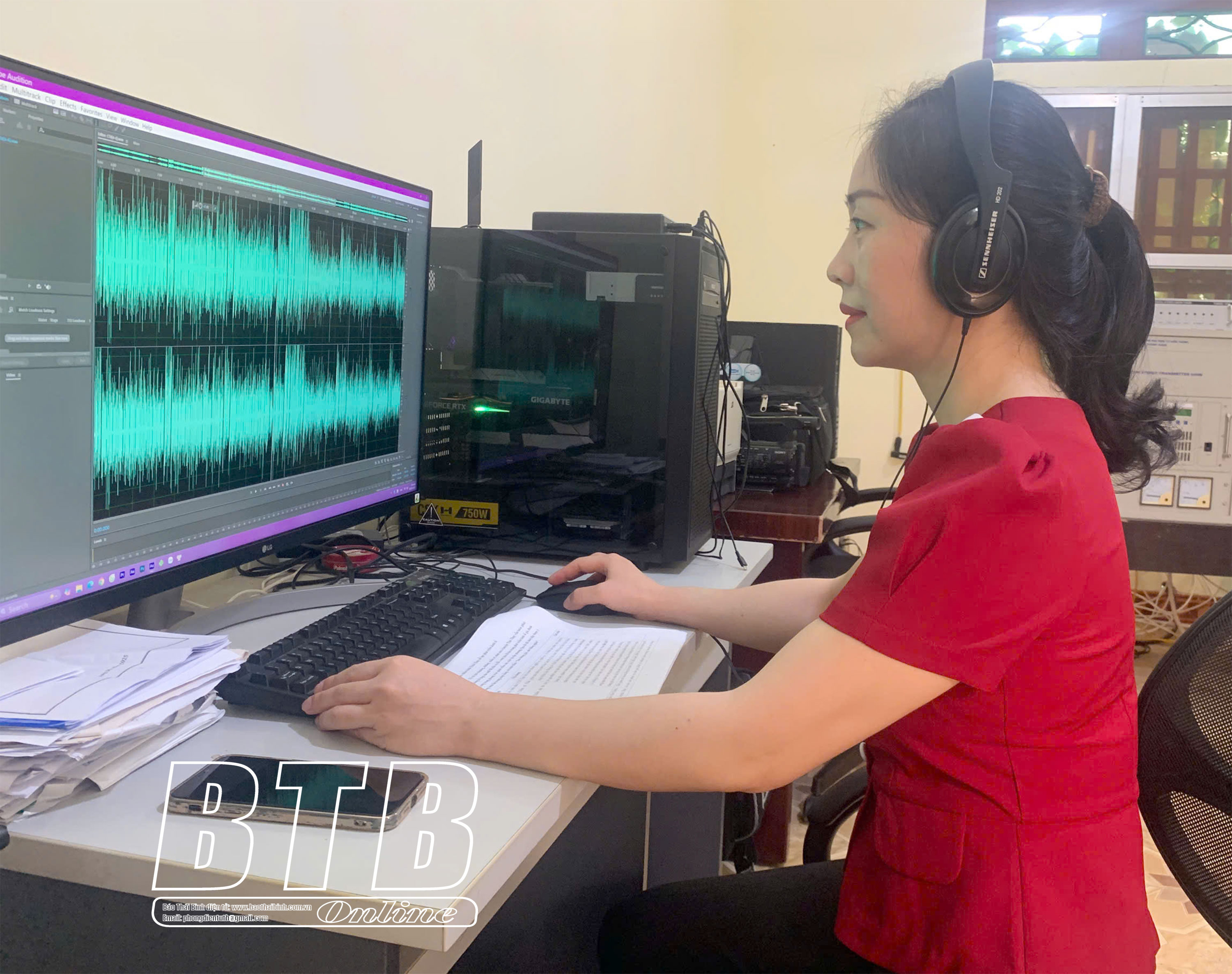 Phóng viên Hoàng Hương, Trung tâm Văn hóa Thể thao Thái Thụy hoàn thiện bản tin phát thanh.
