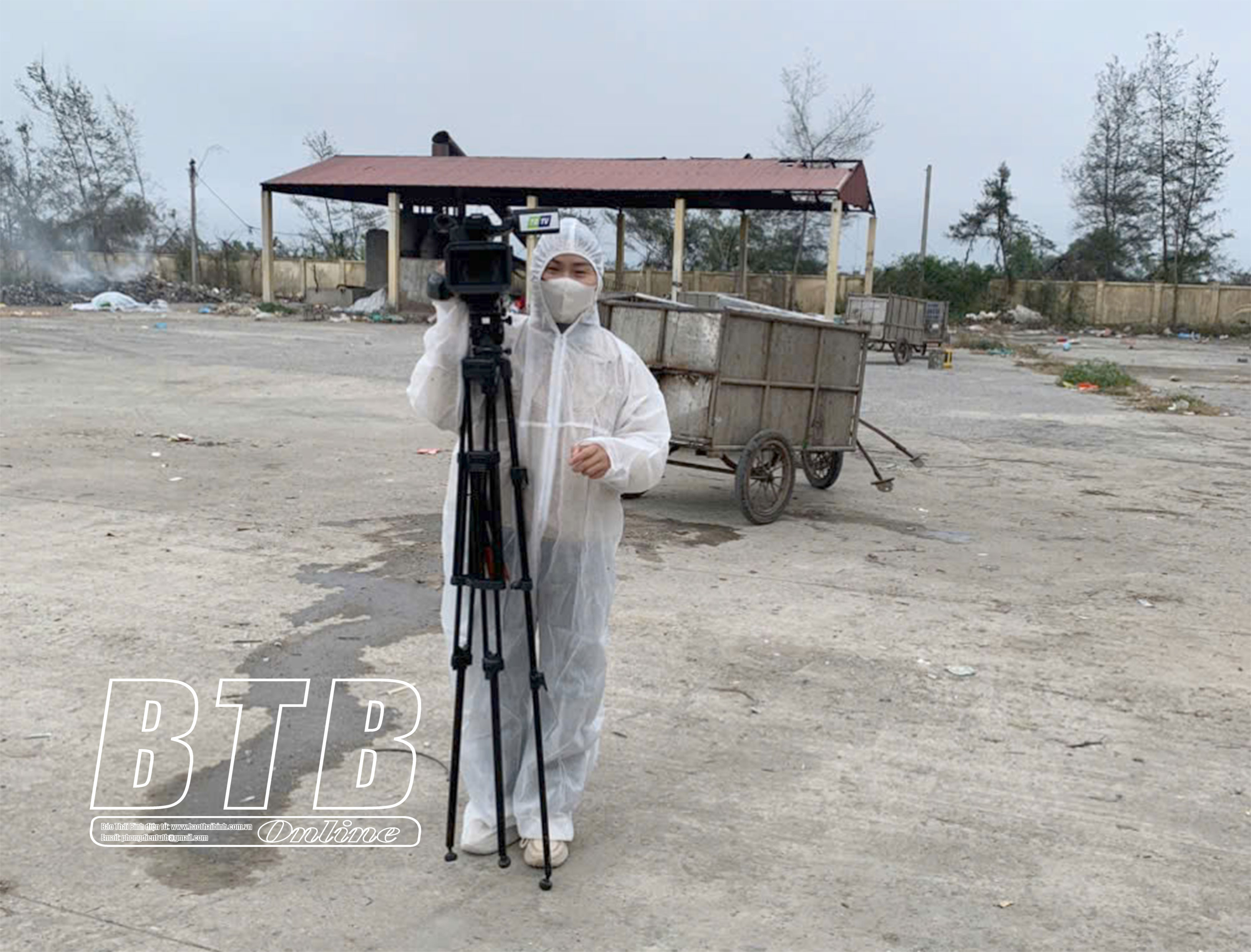 Phóng viên Hương Giang, Trung tâm Văn hoá Thể thao Thái Thụy, tác nghiệp ghi hình thực hiện phóng sự “Ô nhiễm rác thải nông thôn”.