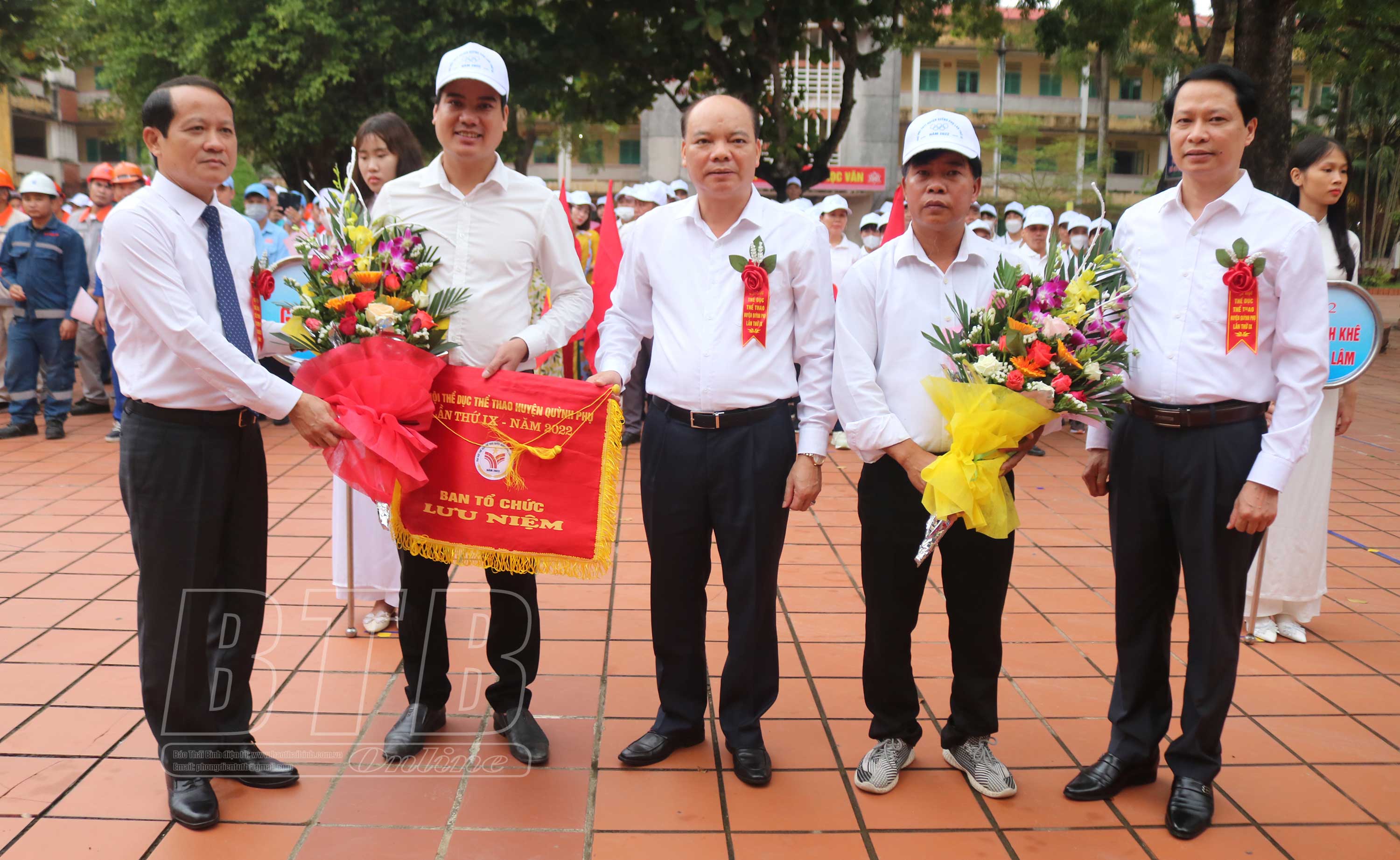 Các đồng chí lãnh đạo tỉnh và huyện Quỳnh Phụ tặng hoa, cờ lưu niệm cho các đoàn tham gia Đại hội.