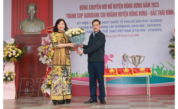 Lãnh đạo Huyện ủy Đông Hưng tặng hoa chúc mừng.