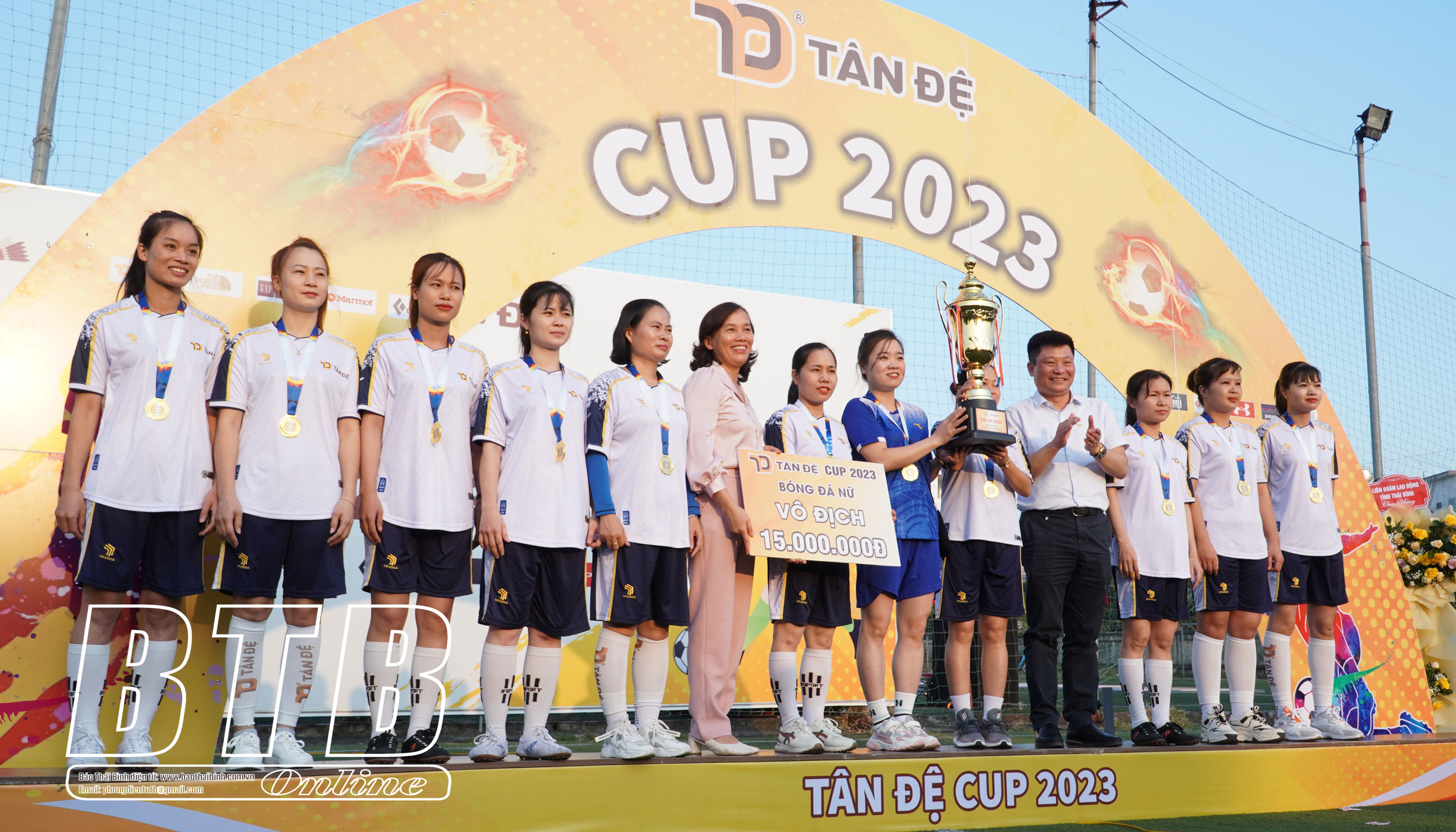 Lãnh đạo Liên đoàn Lao động tỉnh và Công ty Tân Đệ trao Cup vô địch cho đội bóng đá nữ.