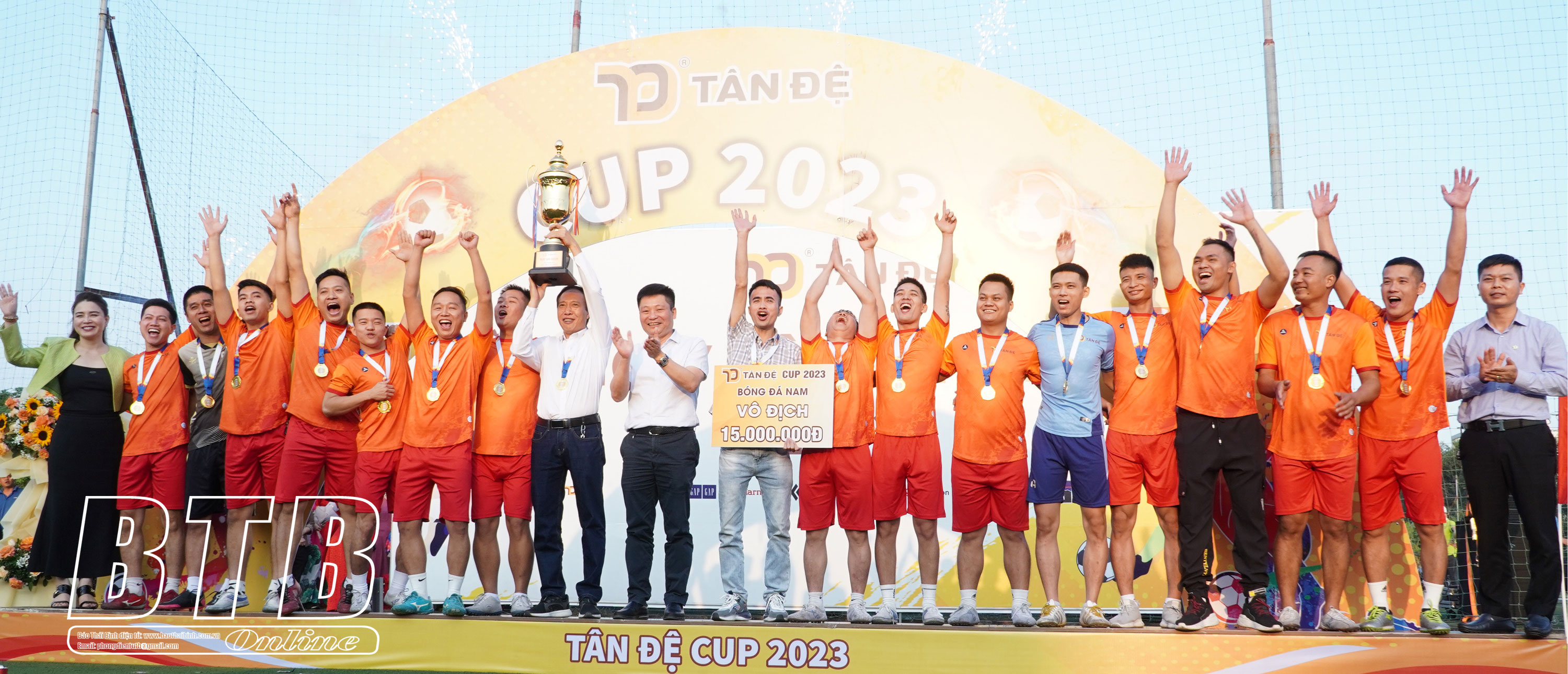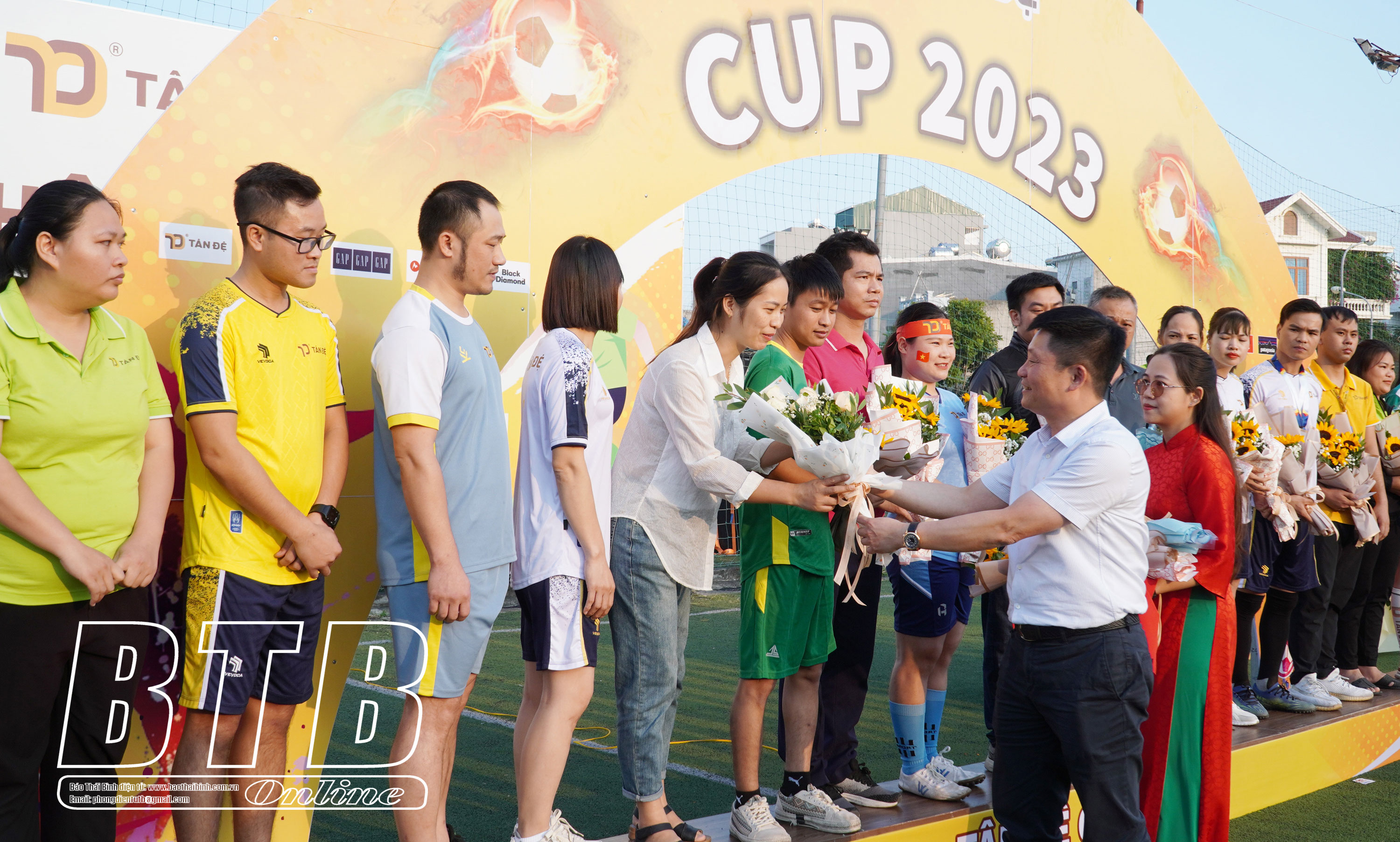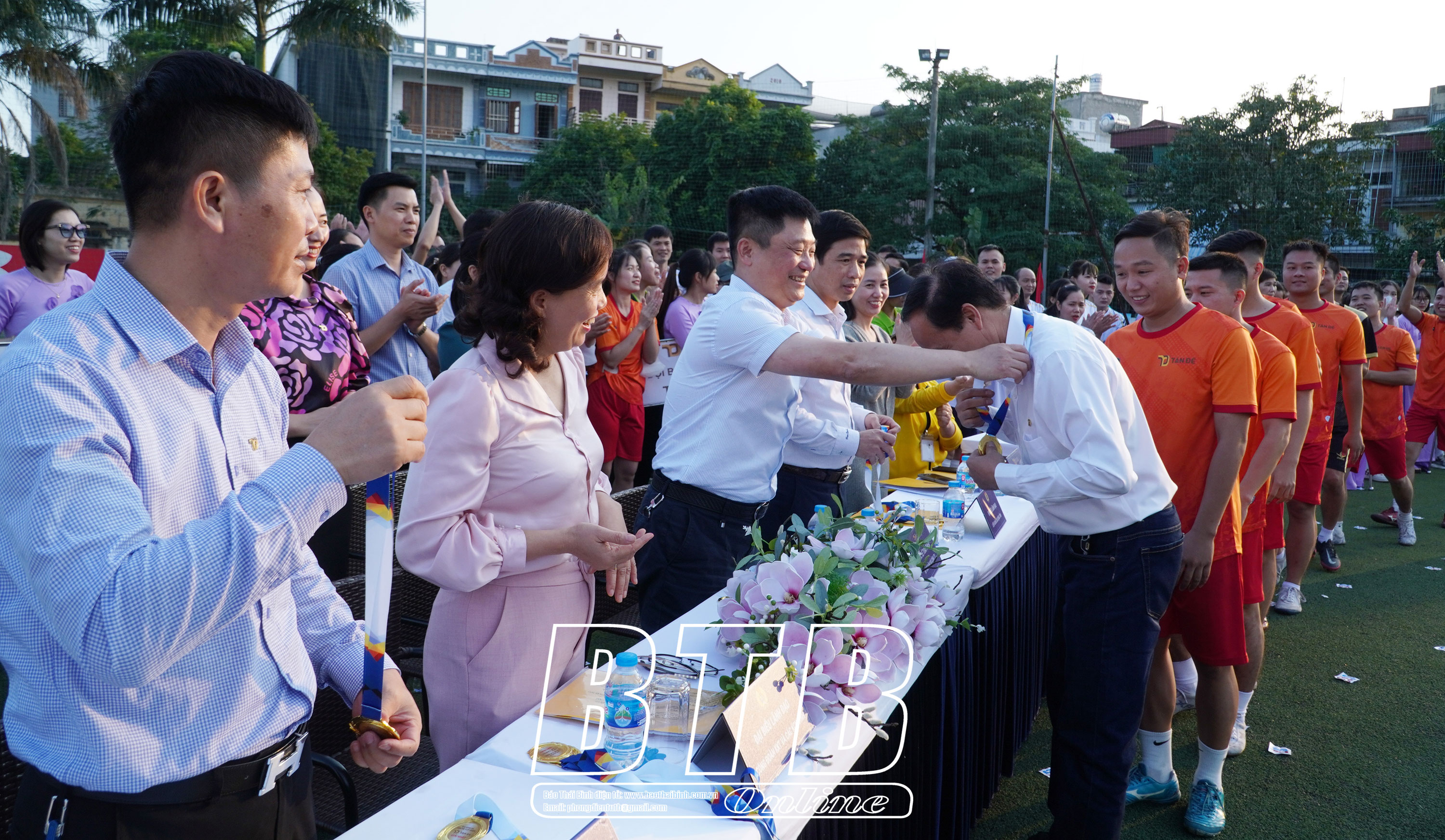 Lãnh đạo Công ty Tân Đệ trao Huy chương Vàng cho đội bóng đá nam.