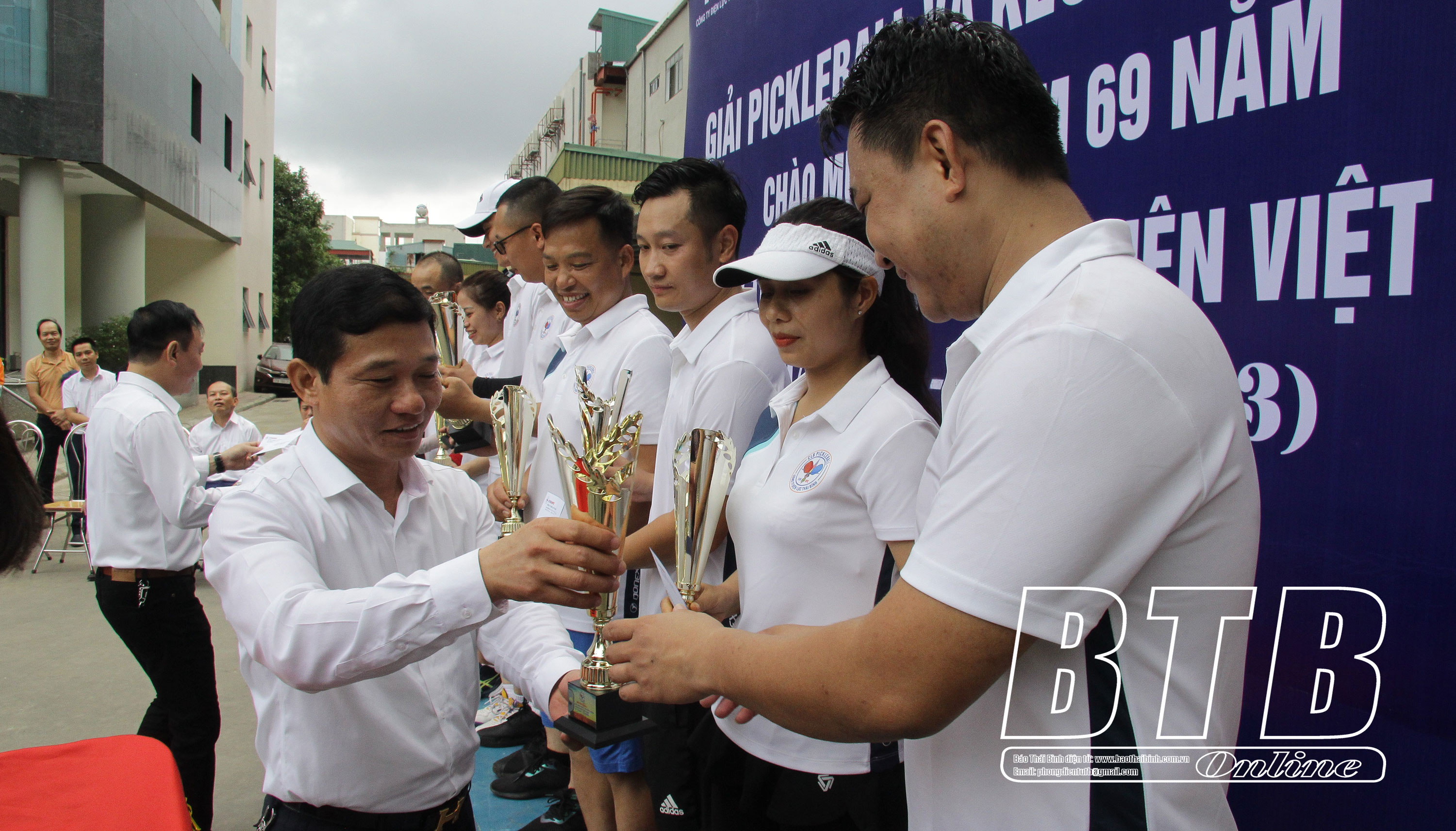Lãnh đạo Công ty Điện lực Thái Bình trao cúp cho các đội tham dự môn pickleball.