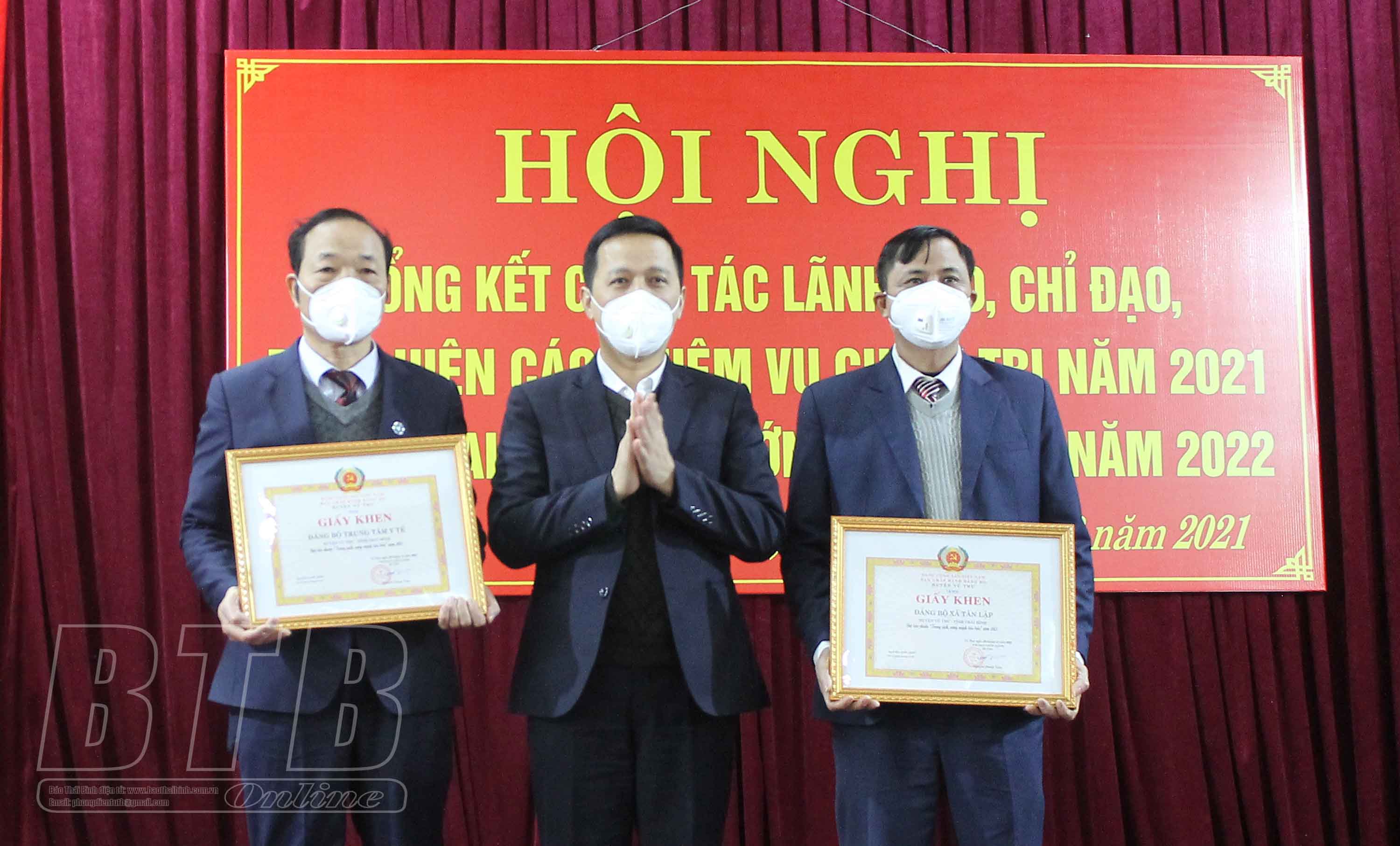 Đồng chí Nguyễn Thanh Tuấn, Tỉnh ủy viên, Bí thư Huyện ủy Vũ Thư tặng giấy khen của Ban Thường vụ Huyện ủy cho 2 tổ chức cơ sở đảng đạt danh hiệu "trong sạch vững mạnh tiêu biểu" năm 2021.