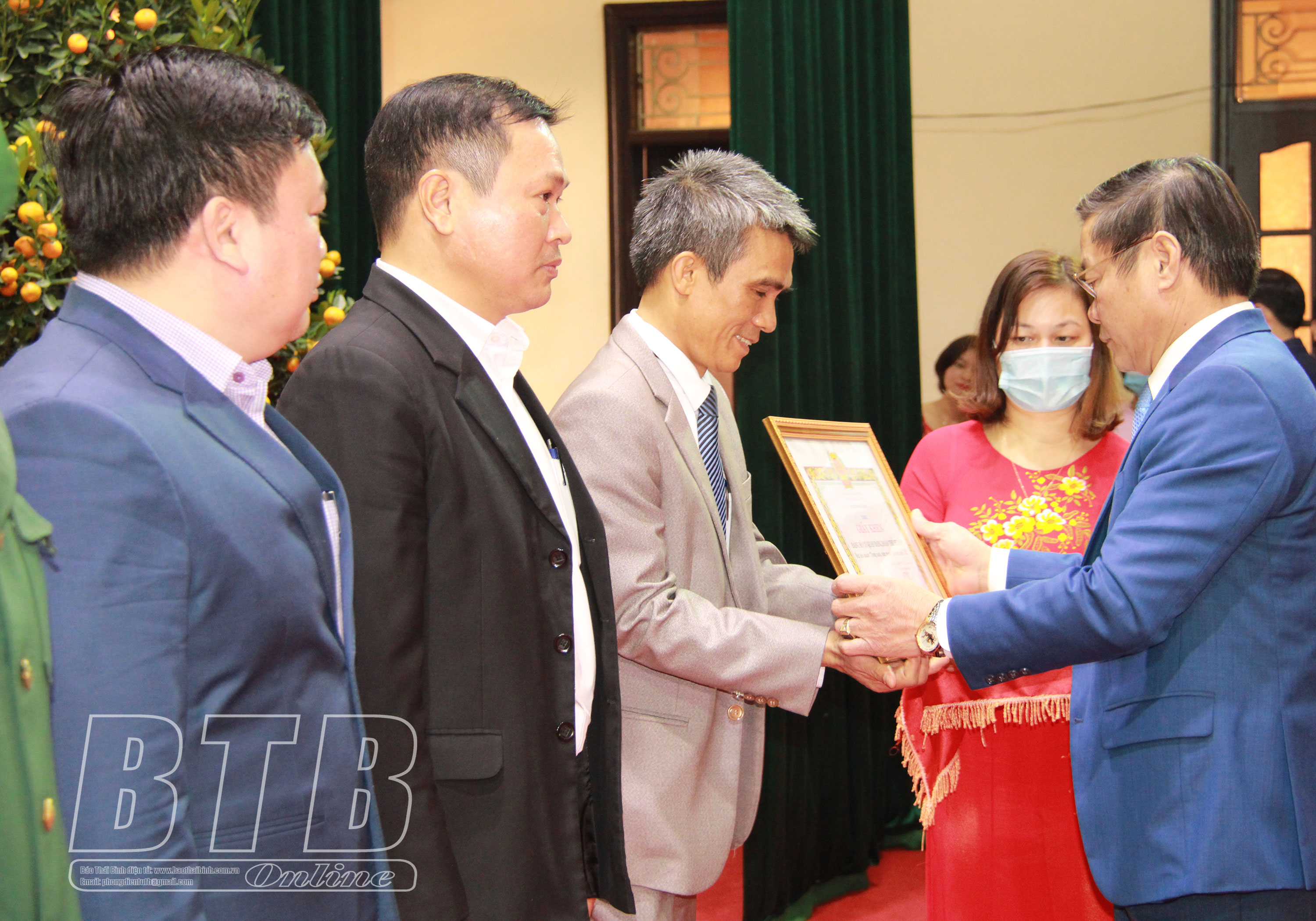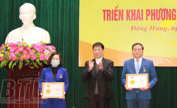 Đại diện lãnh đạo huyện Đông Hưng trao trao giấy khen cho các đảng bộ đạt tiêu chuẩn hoàn thành xuất sắc nhiệm vụ.