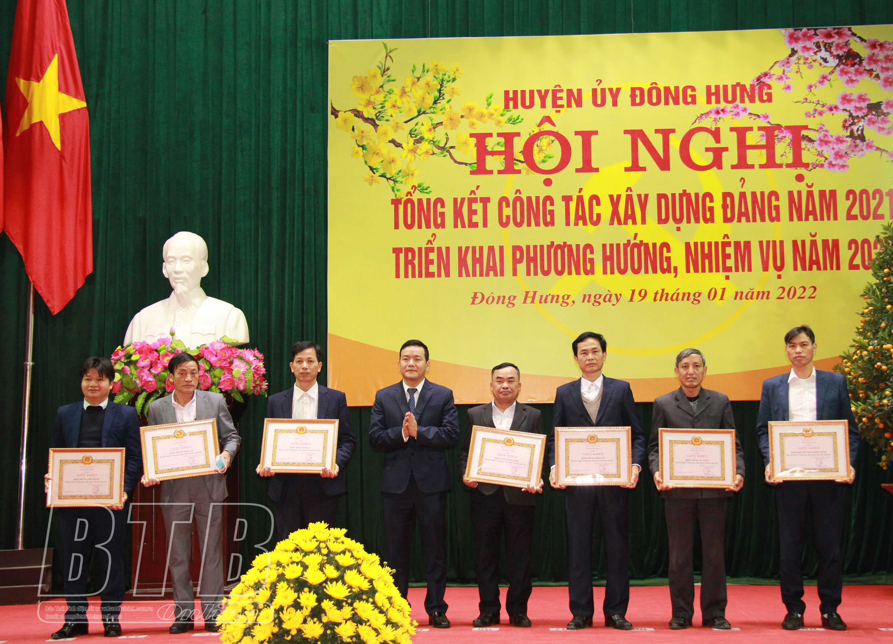 Năm 2021, công tác xây dựng Đảng, chính quyền, MTTQ, các đoàn thể chính trị trên địa bàn huyện Đông Hưng được thực hiện đồng bộ, hiệu quả; vai trò lãnh đạo của cấp ủy, tổ chức đảng và công tác quản lý, điều hành của chính quyền các cấp được nâng lên. Đặc biệt, huyện đã tổ chức thành công cuộc bầu cử đại biểu Quốc hội khóa XV và đại biểu HĐND các cấp, nhiệm kỳ 2021 - 2026; hoàn thành sắp xếp bộ máy chính quyền sau bầu cử từ huyện đến cơ sở. Đến nay, toàn huyện có 60 tổ chức cơ sở đảng với 13.500 đảng viên; trong năm kết nạp 109 đảng viên mới, tổ chức trao huy hiệu Đảng cho trên 1.100 đảng viên cao tuổi Đảng. Năm 2021, toàn huyện có 12 tổ chức cơ sở đảng hoàn thành xuất sắc nhiệm vụ; 45 tổ chức cơ sở đảng hoàn thành tốt nhiệm vụ; 3 tổ chức cơ sở đảng hoàn thành nhiệm vụ. Cũng trong năm qua, Đảng bộ huyện đã tập trung lãnh đạo, chỉ đạo thực hiện hiệu quả mục tiêu kép vừa phát triển kinh tế vừa phòng, chống dịch Covid-19 hiệu quả. Tổng giá trị sản xuất năm 2021 tăng 9,1% so với năm 2020, tỷ lệ hộ nghèo giảm xuống còn 2,23%.