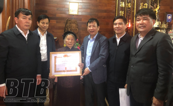 Các đồng chí lãnh đạo huyện Hưng Hà trao Huy hiệu 75 năm tuổi Đảng cho đảng viên Nguyễn Thị Sinh, thôn Đồng Lạc, xã Minh Khai.
