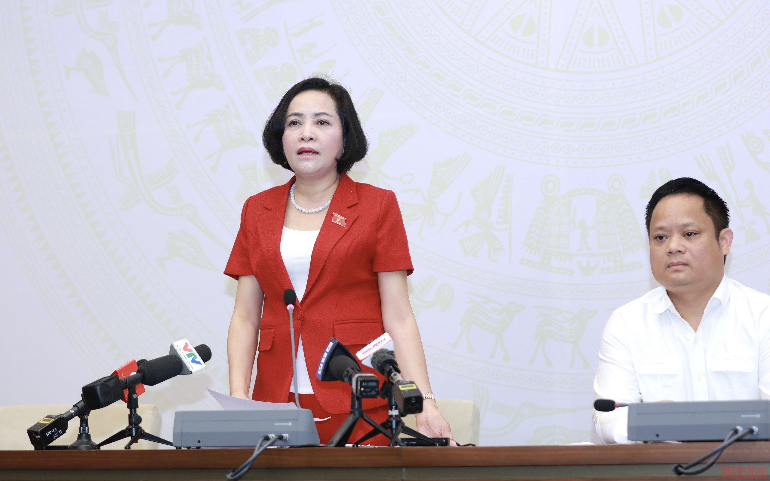 Bà Nguyễn Thị Thanh, Ủy viên Ủy ban Thường vụ Quốc hội, Trưởng Ban Công tác đại biểu thông tin với báo chí về công tác nhân sự tại Kỳ họp thứ ba, Quốc hội khóa XV, sáng 7/6. (Ảnh: LINH KHOA)