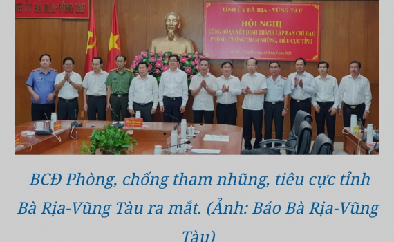 Ngày 16/6, Tỉnh ủy Bà Rịa-Vũng Tàu đã tổ chức công bố Quyết định số 507-QĐ/TU ngày 16/6/2022 về việc thành lập Ban Chỉ đạo phòng, chống tham nhũng, tiêu cực tỉnh. Ban Chỉ đạo phòng, chống tham nhũng, tiêu cực tỉnh Bà Rịa-Vũng Tàu làm việc theo Quy định 67-QĐ/TW, ngày 2/6/2022 của Ban Bí thư về chức năng, nhiệm vụ, quyền hạn, tổ chức bộ máy, chế độ làm việc, quan hệ công tác của Ban Chỉ đạo phòng, chống tham nhũng, tiêu cực tỉnh, thành phố trực thuộc Trung ương.