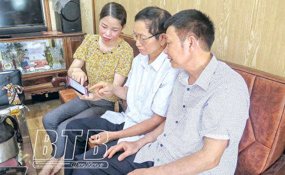 Cán bộ Văn phòng Đảng ủy thị trấn Kiến Xương hướng dẫn Chi bộ tổ dân phố Cộng Hòa sử dụng phần mềm.