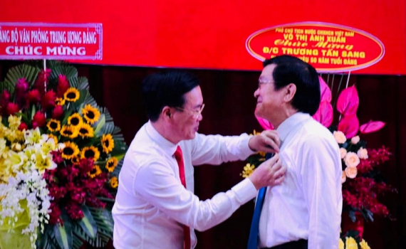 Đồng chí Võ Văn Thưởng mong trong thời gian tới, đồng chí Trương Tấn Sang tiếp tục đóng góp nhiều hơn nữa cho sự nghiệp cách mạng của Đảng, Nhà nước và Nhân dân ta.