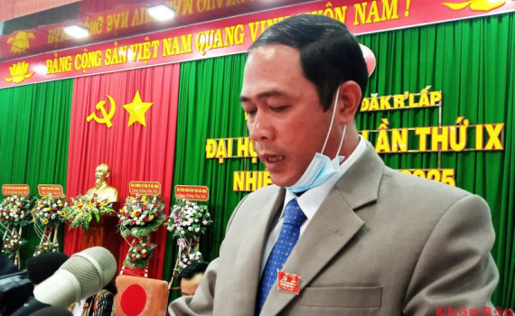 Ông Lê Mai Toản khi còn là Phó Bí thư Thường trực Huyện ủy Đắk R’Lấp, phát biểu tại Đại hội đảng bộ huyện Đắk R’Lấp nhiệm kỳ 2020-2025.