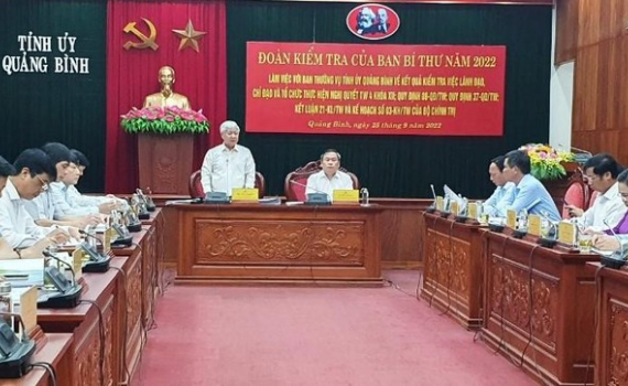 Trước đó, từ ngày 20/9, Đoàn Kiểm tra 545 của Ban Bí thư Trung ương Đảng đã làm việc với Ban Thường vụ Tỉnh ủy Quảng Bình để kiểm tra công tác lãnh đạo, chỉ đạo, tổ chức thực hiện Nghị quyết Trung ương 4 khóa XII về tăng cường xây dựng, chỉnh đốn Đảng, ngăn chặn, đẩy lùi sự suy thoái về tư tưởng chính trị, đạo đức, lối sống, những biểu hiện “tự diễn biến”, “tự chuyển hóa” trong nội bộ và các quy định, kết luận của Ban Chấp hành Trung ương Đảng về trách nhiệm nêu gương của cán bộ, đảng viên; về những điều đảng viên không được làm; kiên quyết ngăn chặn, đẩy lùi, xử lý nghiêm cán bộ, đảng viên suy thoái về tư tưởng chính trị, đạo đức, lối sống, biểu hiện “tự diễn biến”, “tự chuyển hóa” và một số nội dung quan trọng khác.