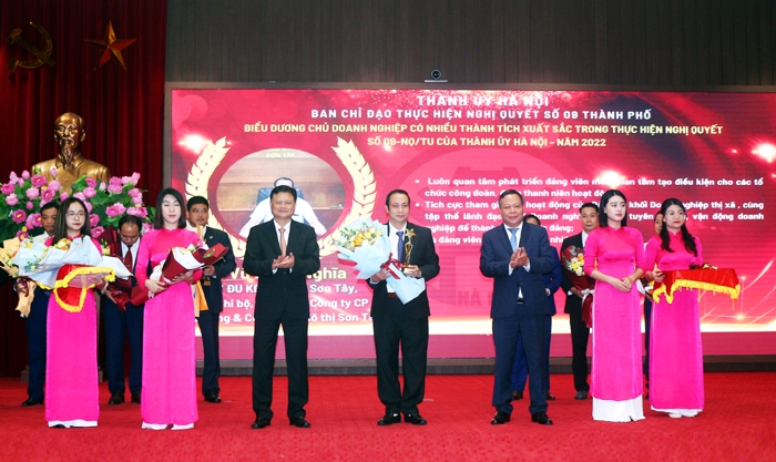 Phó Bí thư Thành ủy Hà Nội Nguyễn Văn Phong và Trưởng ban Tổ chức Thành ủy Vũ Đức Bảo vinh danh chủ doanh nghiệp tiêu biểu trong phát triển Đảng, đoàn thể.