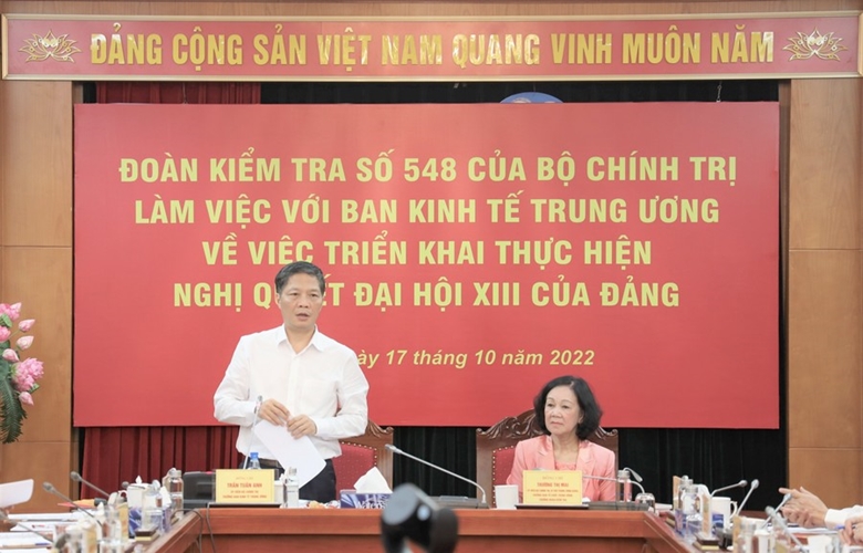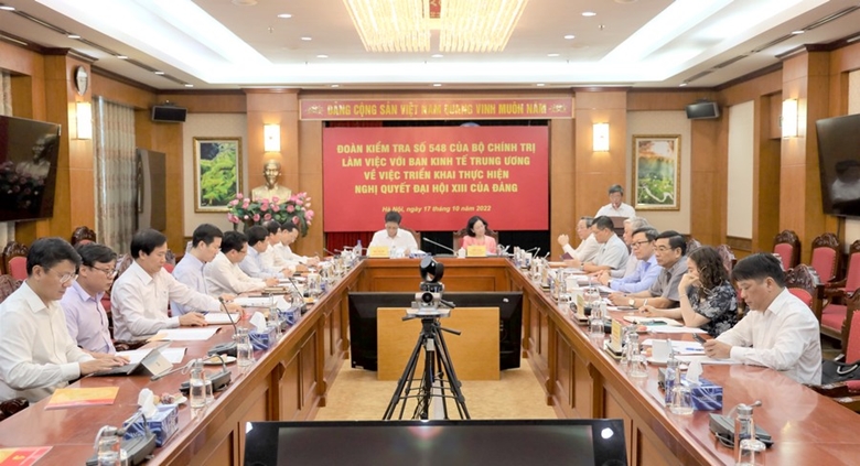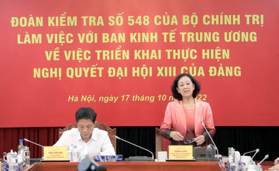 Chiều ngày 17/10/2022, Đoàn kiểm tra số 548 của Bộ Chính trị do đồng chí Trương Thị Mai, Ủy viên Bộ Chính trị, Bí thư Trung ương Đảng, Trưởng Ban Tổ chức Trung ương, Trưởng đoàn Kiểm tra làm việc với Ban Kinh tế Trung ương để thông qua Dự thảo Báo cáo kết quả kiểm tra triển khai thực hiện Nghị quyết Đại hội XIII của Đảng đối với Ban Kinh tế Trung ương.