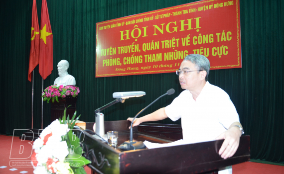 Đồng chí Trưởng ban Tuyên giáo Tỉnh ủy thông tin tình hình thời sự trong nước, quốc tế gắn với công tác phòng, chống tham nhũng, tiêu cực; định hướng công tác thông tin tuyên truyền về phòng, chống tham nhũng, tiêu cực trong thời gian tới. Đồng chí đề nghị sau hội nghị, huyện tiếp tục đẩy mạnh công tác tuyên truyền, quán triệt các văn bản chỉ đạo của trung ương, của tỉnh về phòng, chống tham nhũng, tiêu cực nhằm tạo sự thống nhất trong nhận thức và hành động của cán bộ, đảng viên và các tầng lớp nhân dân. Tăng cường kiểm tra, giám sát, thanh tra, điều tra, truy tố, xét xử, thi hành án tham nhũng, kiên quyết thu hồi tài sản tham nhũng. Phát huy hiệu quả vai trò của MTTQ, các đoàn thể chính trị - xã hội trong công tác phòng, chống tham nhũng, tiêu cực. Chú trọng thực hiện tốt nguyên tắc tập trung dân chủ trong hoạt động của các cơ quan, địa phương, đơn vị; xây dựng mối quan hệ đoàn kết, thống nhất trong nội bộ.