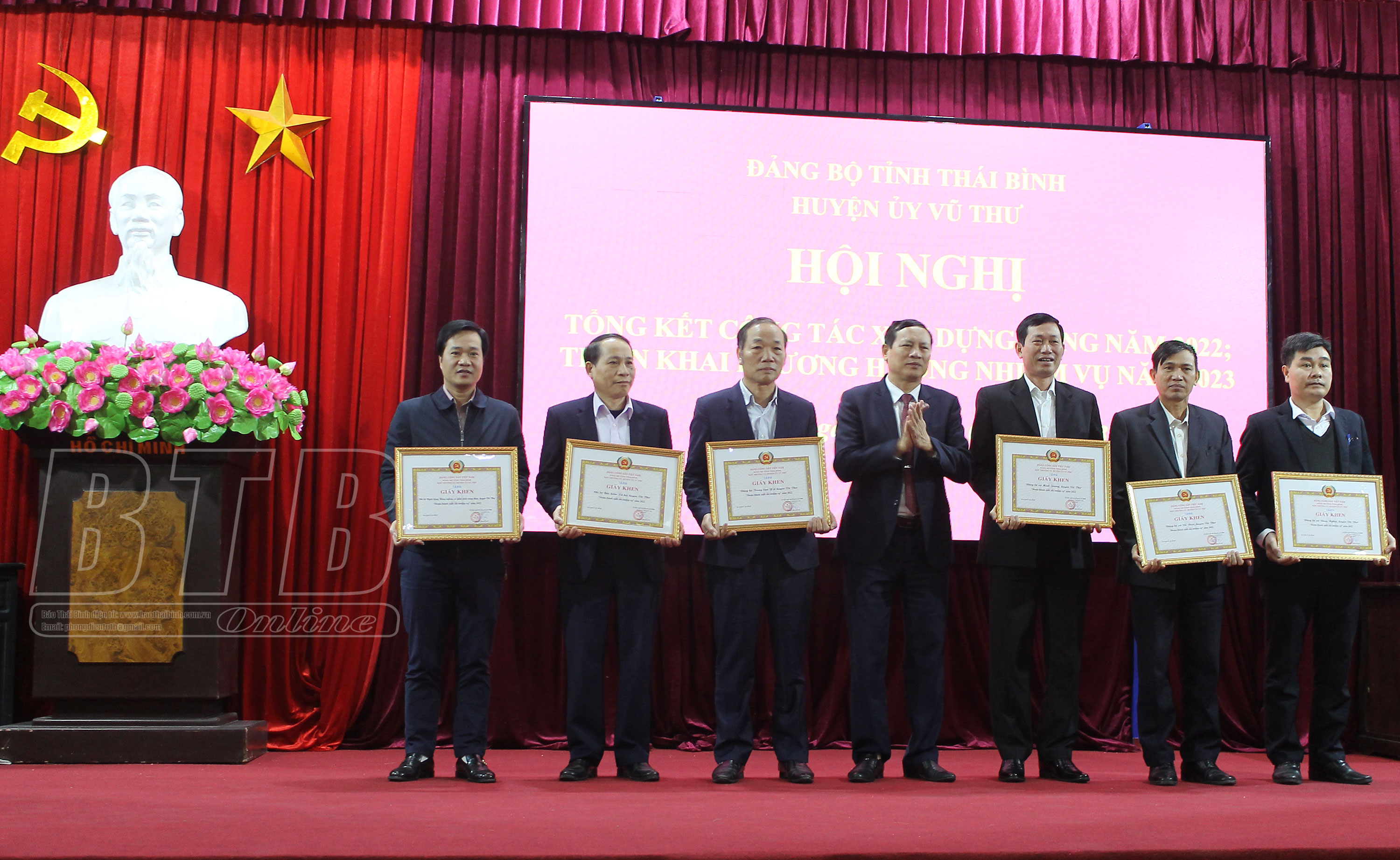 Lãnh đạo Huyện ủy Vũ Thư trao giấy khen cho các tổ chức cơ sở đảng hoàn thành xuất sắc nhiệm vụ năm 2022.