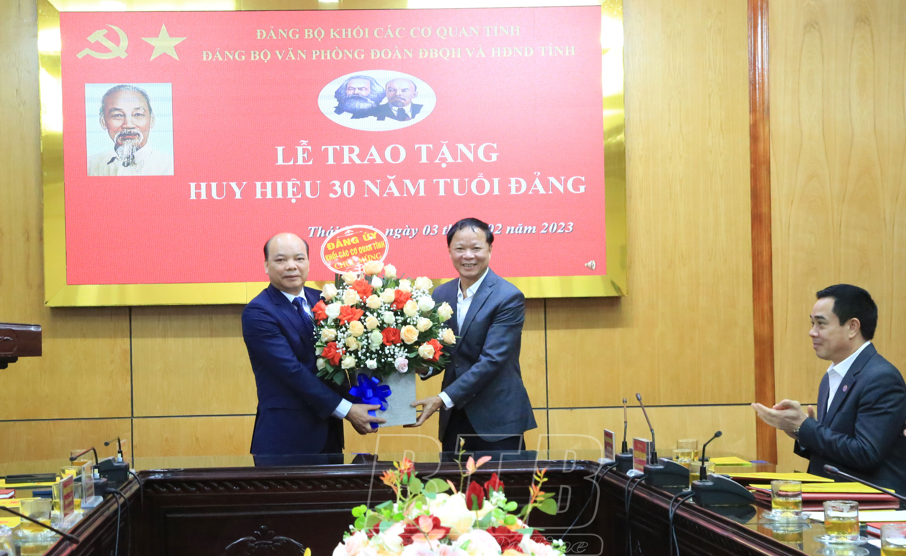 Đồng chí Vũ Ngọc Trì, Tỉnh ủy viên, Phó Chủ tịch HĐND tỉnh tặng hoa chúc mừng đồng chí Đặng Thanh Giang.