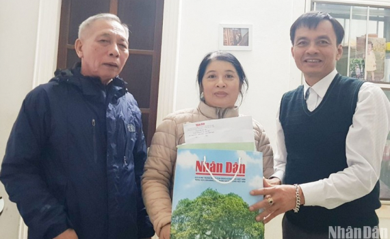 Bí thư Chi bộ Khu phố 5, phường 5, thành phố Đông Hà (bên trái) tặng các ấn phẩm Báo Nhân Dân cho bạn đọc nhân dịp Tết Quý Mão 2023.