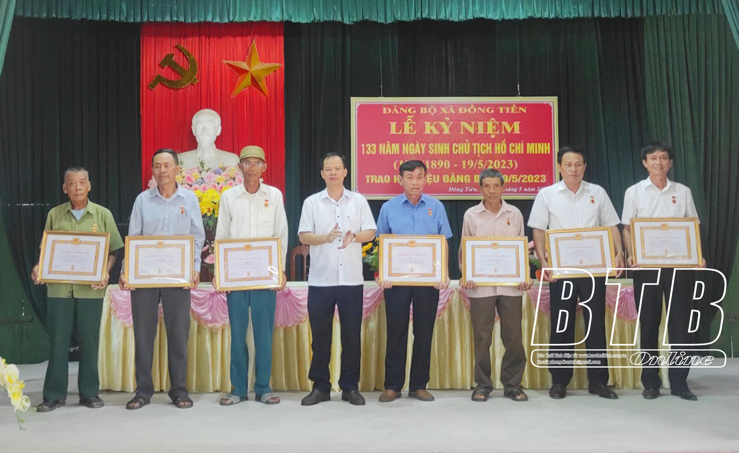 Lãnh đạo Huyện ủy Quỳnh Phụ trao Huy hiệu Đảng cho các đảng viên nhiều năm tuổi Đảng xã Đồng Tiến.
