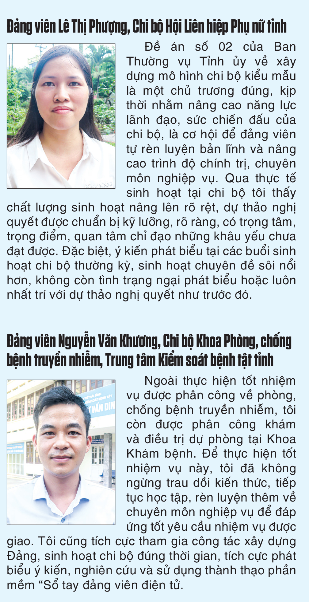 Đồng chí Đặng Quang Huy, Bí thư Chi bộ, Trưởng khoa Phòng, chống bệnh truyền nhiễm, Trung tâm Kiểm soát bệnh tật tỉnh cho biết: Là chi bộ được ghép từ 2 khoa với nhiệm vụ chuyên môn hết sức nặng nề song xác định được vai trò, tầm quan trọng của việc xây dựng mô hình chi bộ kiểu mẫu, ngay từ khi được giao Chi bộ đã xác định được chủ đề gắn với nhiệm vụ chuyên môn, nhất là trong thực hiện nhiệm vụ nâng cao chất lượng công tác phòng, chống các bệnh truyền nhiễm, tiêm chủng mở rộng và kiểm dịch y tế quốc tế. Với vai trò Bí thư Chi bộ, tôi sẽ chịu trách nhiệm chính trong việc lãnh đạo, chỉ đạo thực hiện các nhiệm vụ, phân công đồng chí Phó Bí thư Chi bộ chịu trách nhiệm về công tác tổ chức, các hoạt động liên quan, đồng thời phân công nhiệm vụ cụ thể cho từng đảng viên, quyết tâm xây dựng thành công mô hình chi bộ kiểu mẫu.