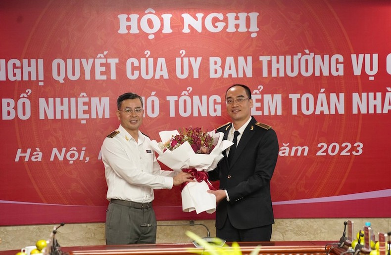 Tổng Kiểm toán Nhà nước Ngô Văn Tuấn tặng hoa chúc mừng tân Phó Tổng Kiểm toán Nhà nước Bùi Quốc Dũng.