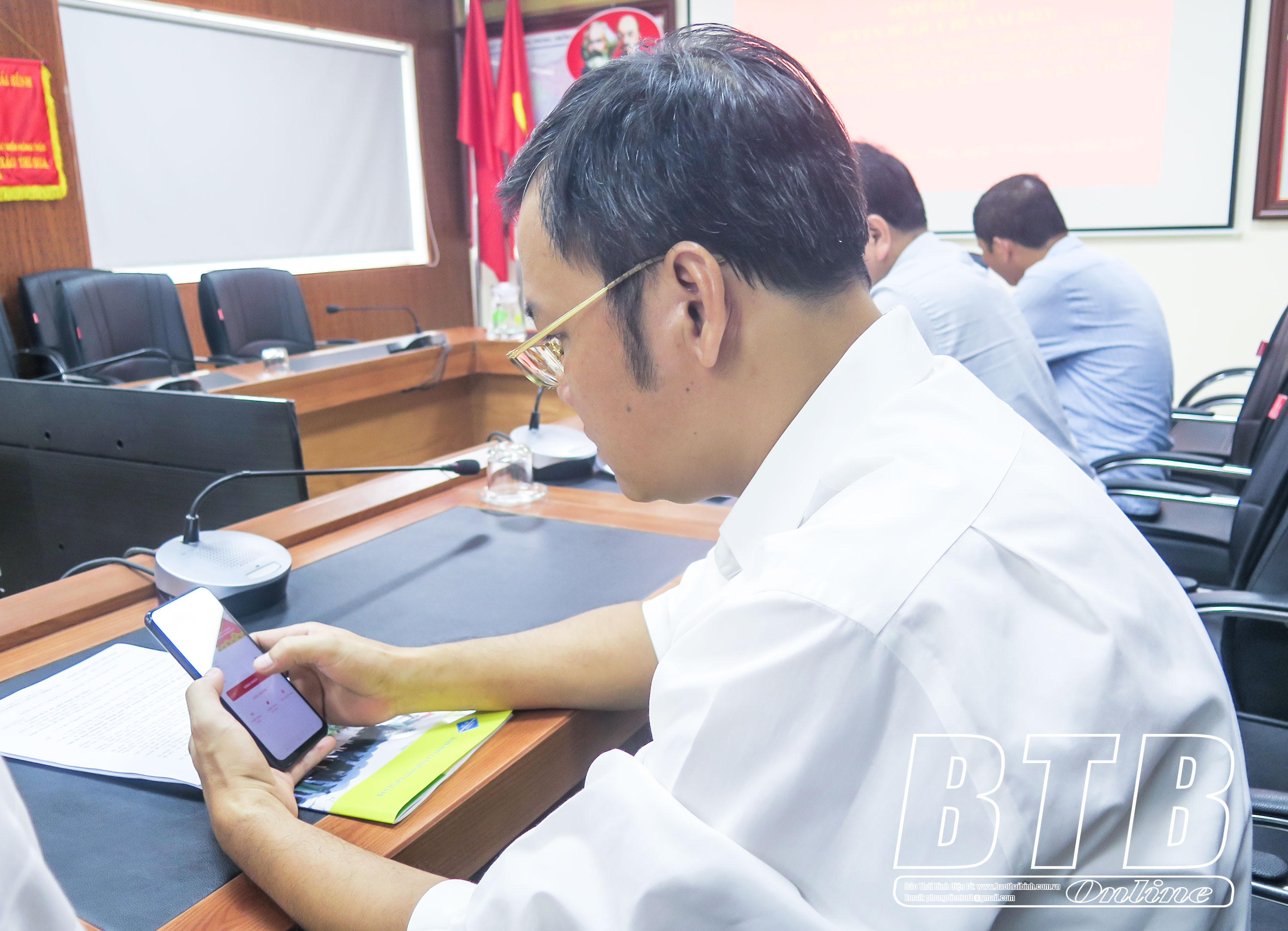 Điểm danh trên phần mềm “Sổ tay đảng viên điện tử” trong sinh hoạt chuyên đề ở Chi bộ Khối Phòng, chống thiên tai, Chi cục Thủy lợi (Sở Nông nghiệp và Phát triển nông thôn).