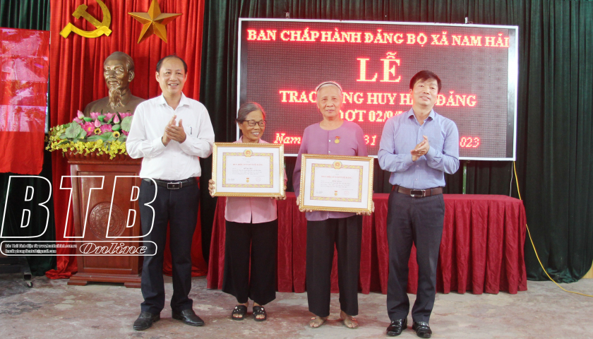 Lãnh đạo Ban Tổ chức Huyện ủy Tiền Hải, Đảng ủy xã Nam Hải trao huy hiệu Đảng cho đảng viên.