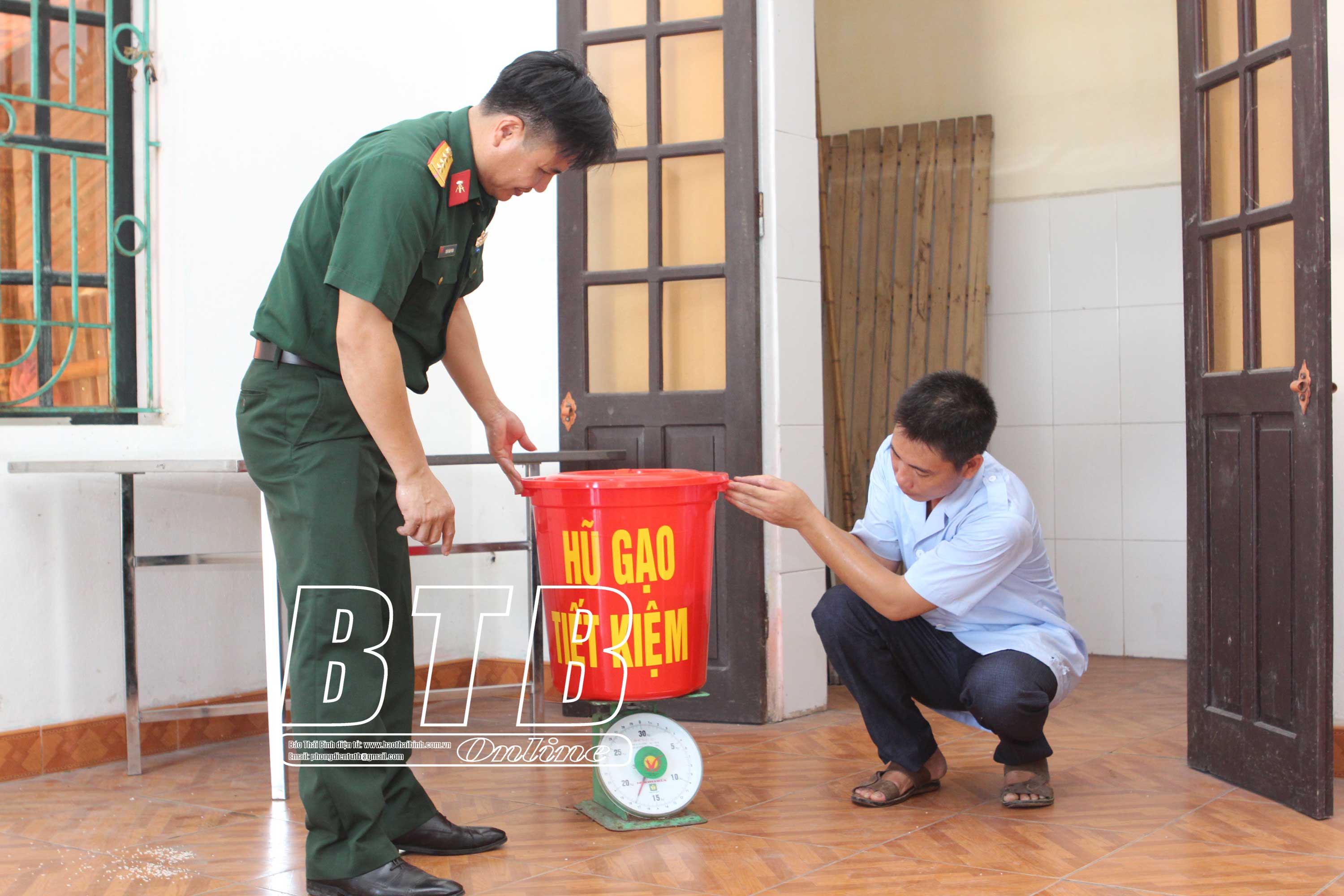 Cán bộ, chiến sĩ Ban Chỉ huy Quân sự huyện Kiến Xương tham gia xây dựng mô hình hũ gạo tiết kiệm.