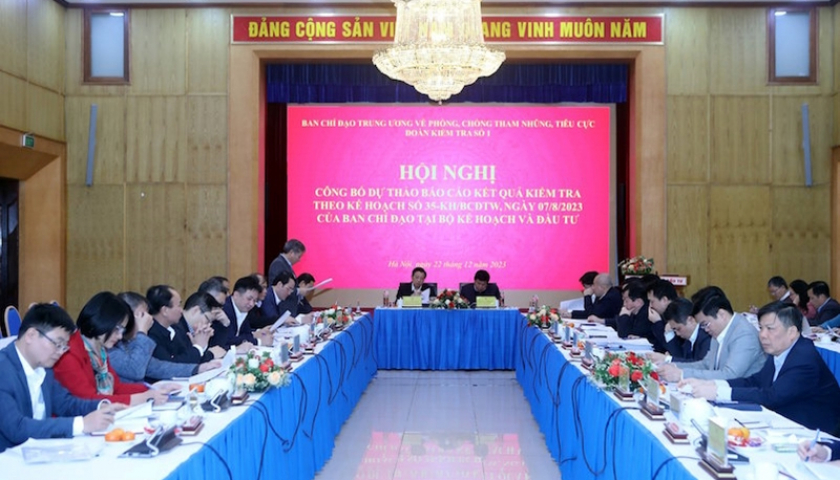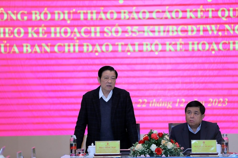Ngày 22/12, đồng chí Phan Đình Trạc, Ủy viên Bộ Chính trị, Bí thư Trung ương Đảng, Trưởng Ban Nội chính Trung ương, Phó Trưởng ban Thường trực Ban Chỉ đạo Trung ương về phòng, chống tham nhũng, tiêu cực, Trưởng Đoàn kiểm tra số 1 của Ban Chỉ đạo đã chủ trì Hội nghị công bố dự thảo Báo cáo kết quả kiểm tra công tác thể chế hóa chủ trương, chính sách của Đảng về phòng, chống tham nhũng, tiêu cực thành pháp luật của Nhà nước theo Kế hoạch số 35-KH/BCĐTW đối với Ban cán sự đảng Bộ Kế hoạch và Đầu tư.