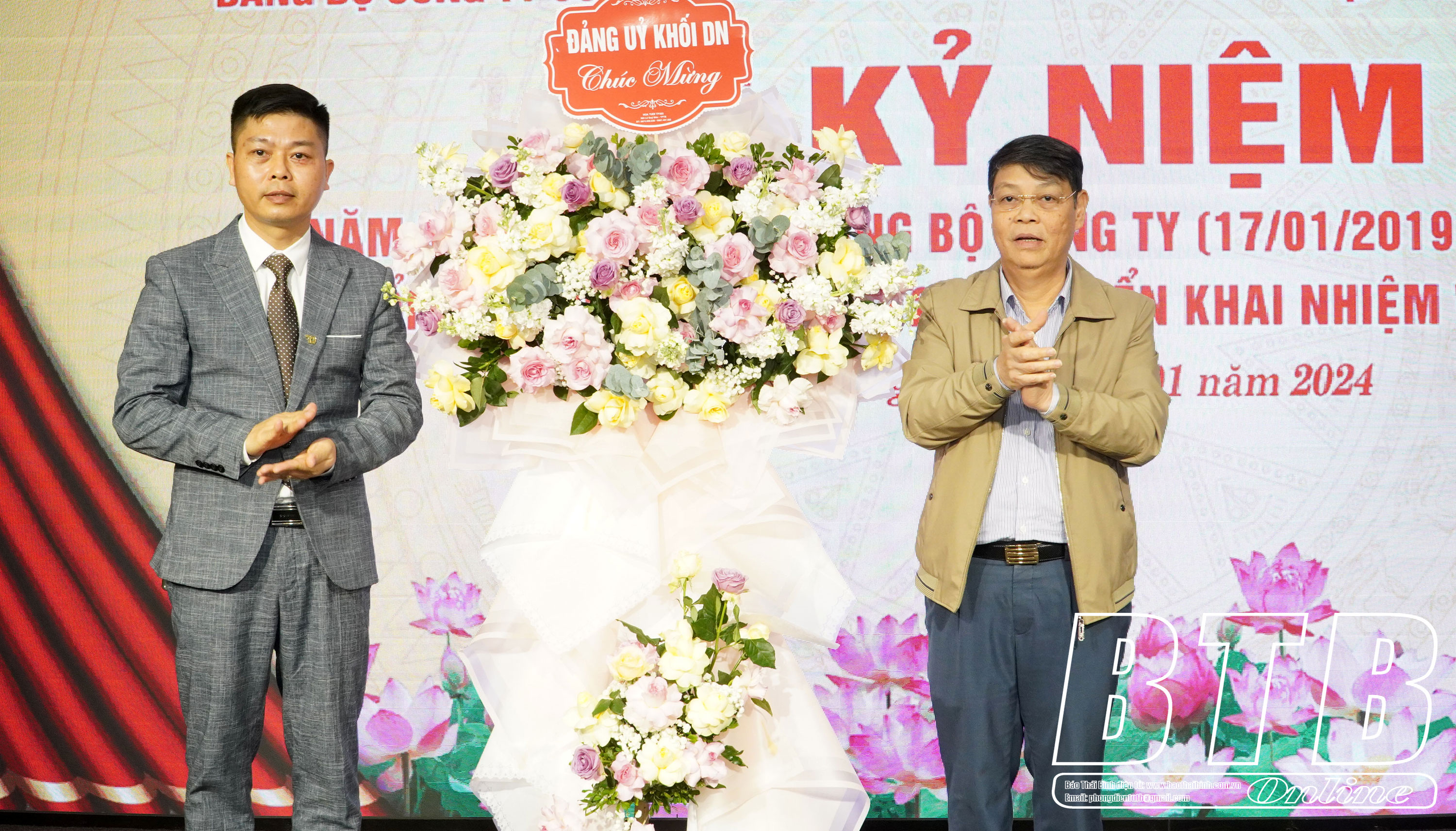 Lãnh đạo Đảng ủy Khối doanh nghiệp tỉnh tặng hoa chúc mừng Đảng bộ Công ty Tân Đệ.