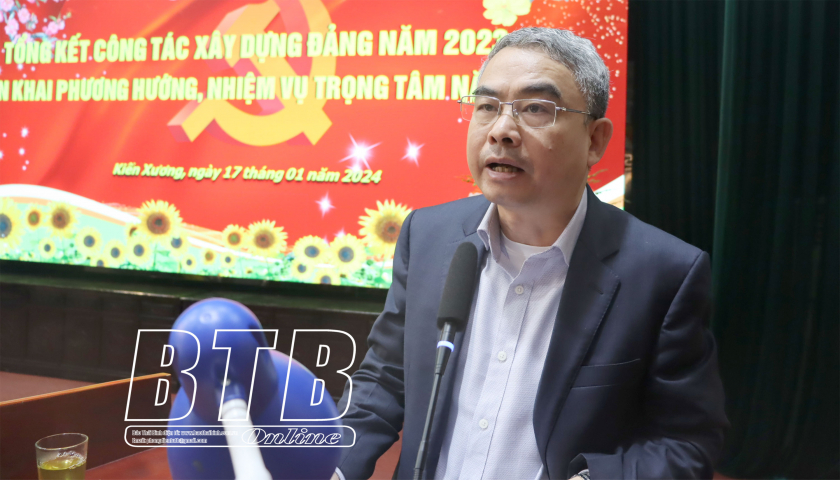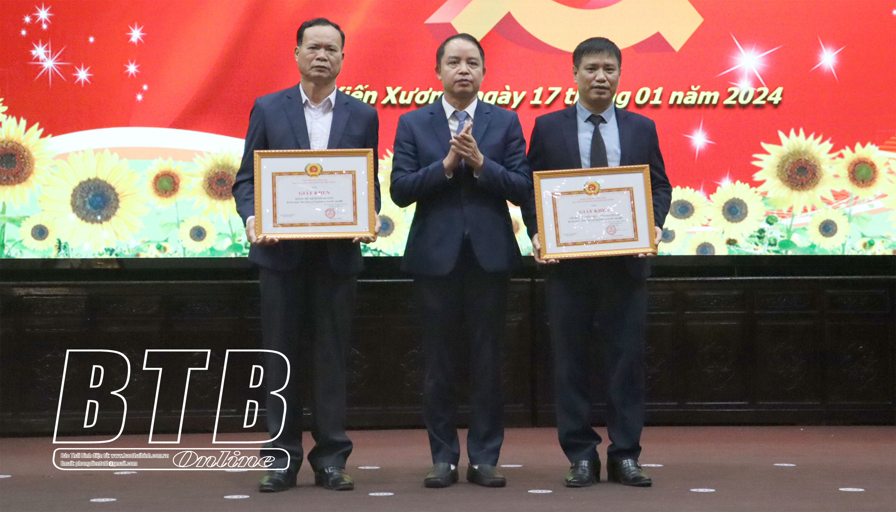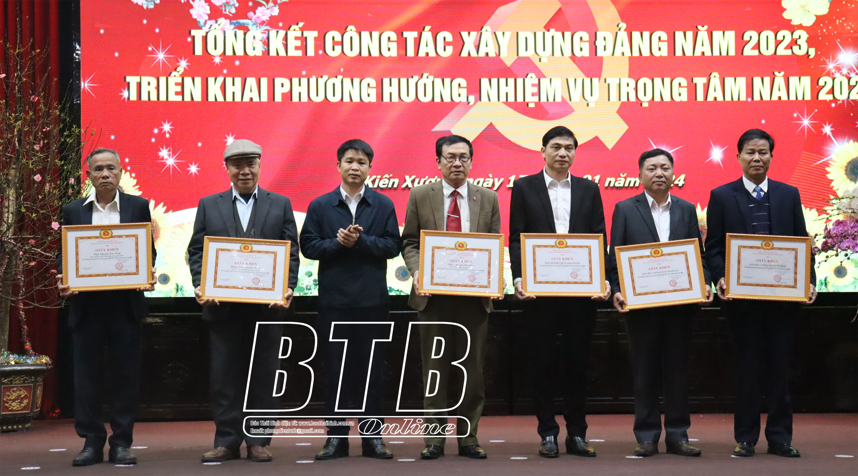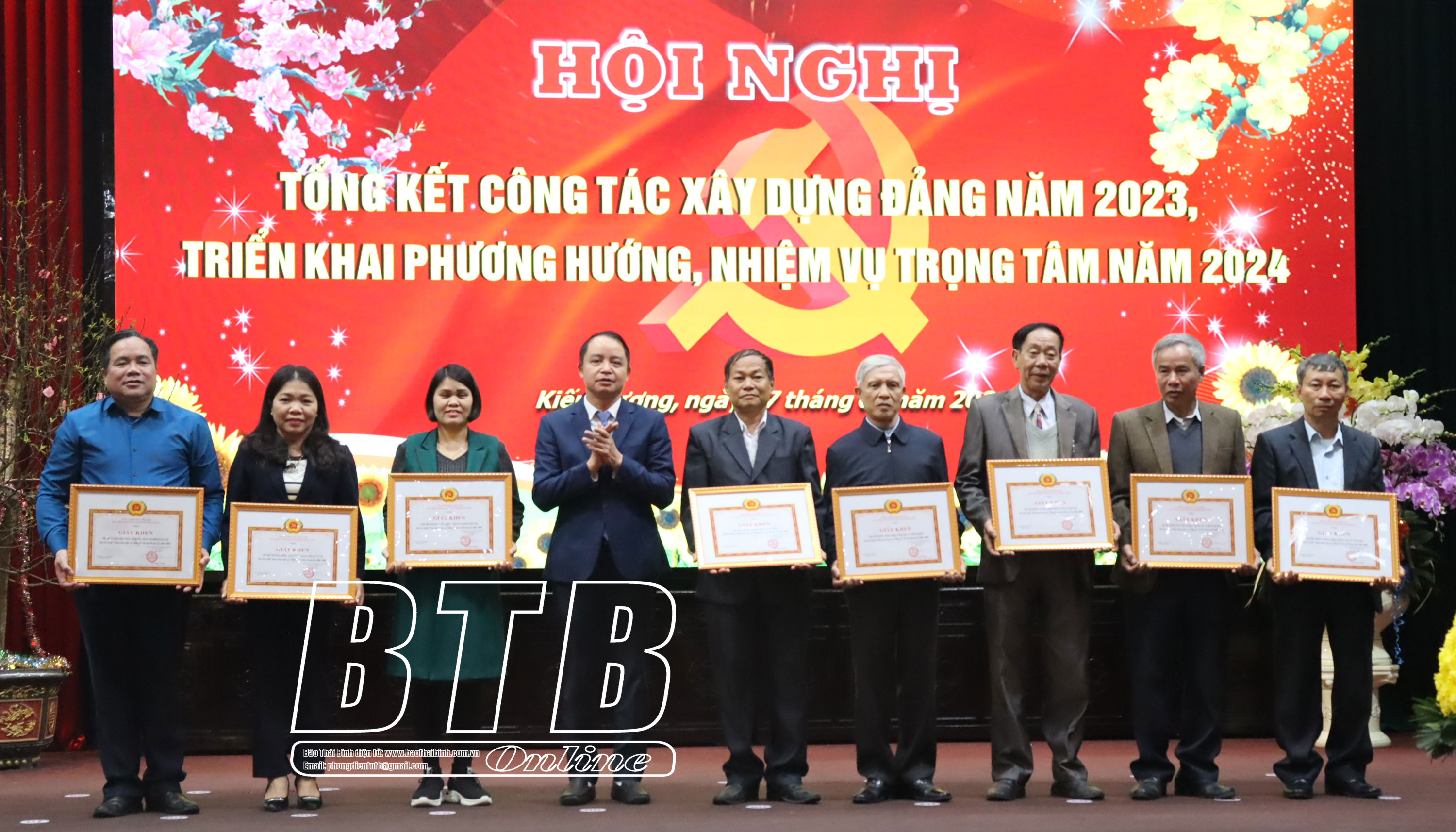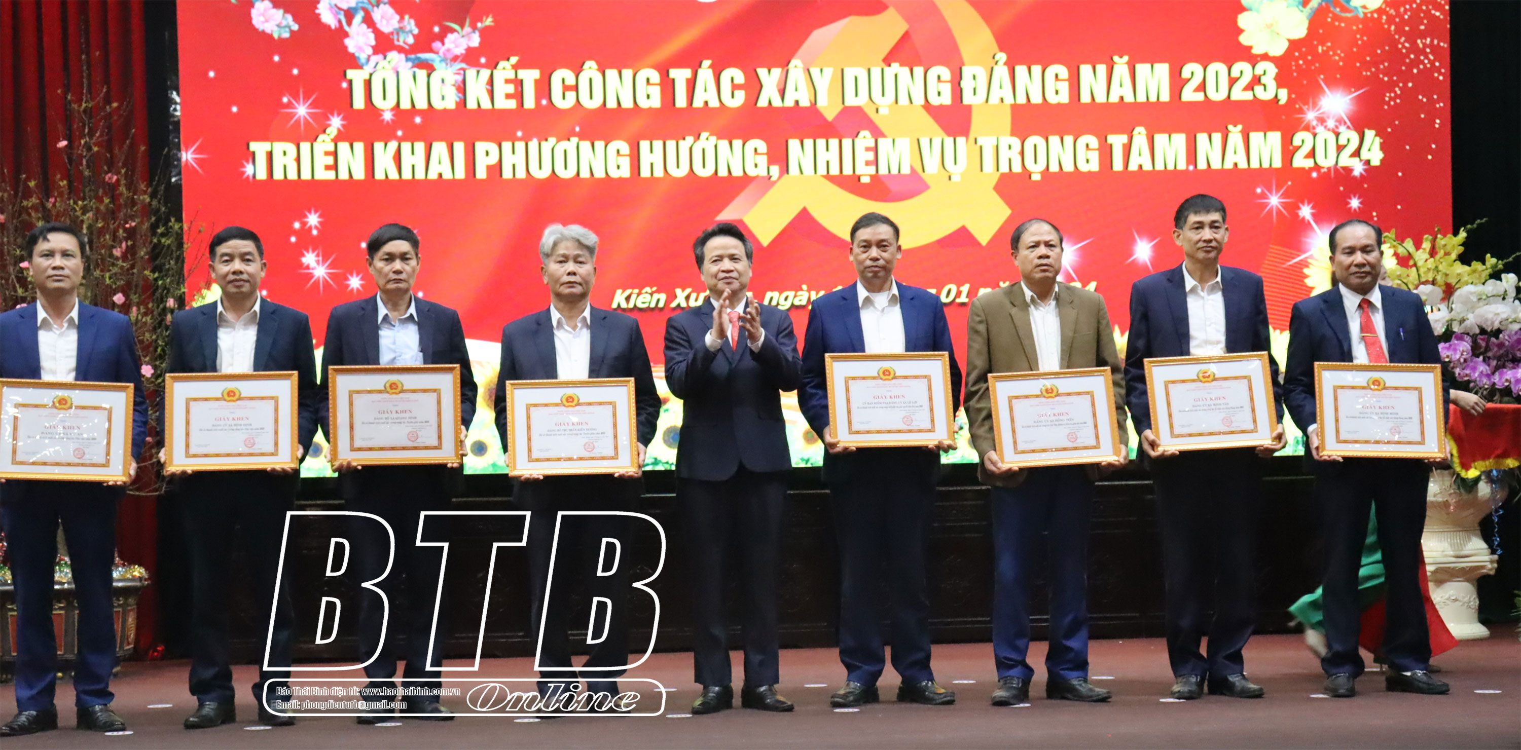 Nhân dịp này, Ban Thường vụ Huyện ủy Kiến Xương đã khen thưởng cho 2 tổ chức cơ sở đảng xuất sắc tiêu biểu năm 2023, 8 chi bộ hoàn thành xuất sắc nhiệm vụ 5 năm liền, 16 tập thể, cá nhân có thành tích xuất sắc trên các lĩnh vực trong công tác xây dựng Đảng, 8 tập thể, cá nhân có thành tích xuất sắc trong học tập và làm theo tư tưởng, đạo đức, phong cách Hồ Chí Minh.