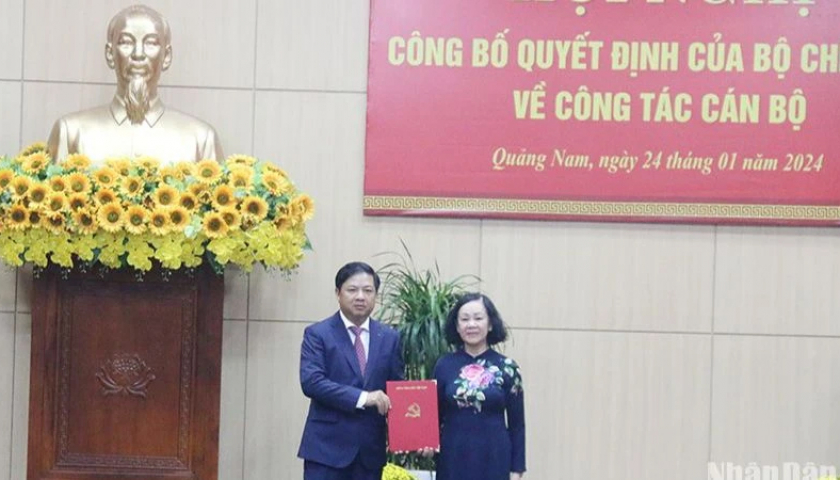 Thay mặt Bộ Chính trị, đồng chí Trương Thị Mai, Ủy viên Bộ Chính trị, Thường trực Ban Bí thư, Trưởng Ban Tổ chức Trung ương trao quyết định điều động, chỉ định đồng chí Lương Nguyễn Minh Triết giữ chức Bí thư Tỉnh ủy Quảng Nam nhiệm kỳ 2020-2025.
