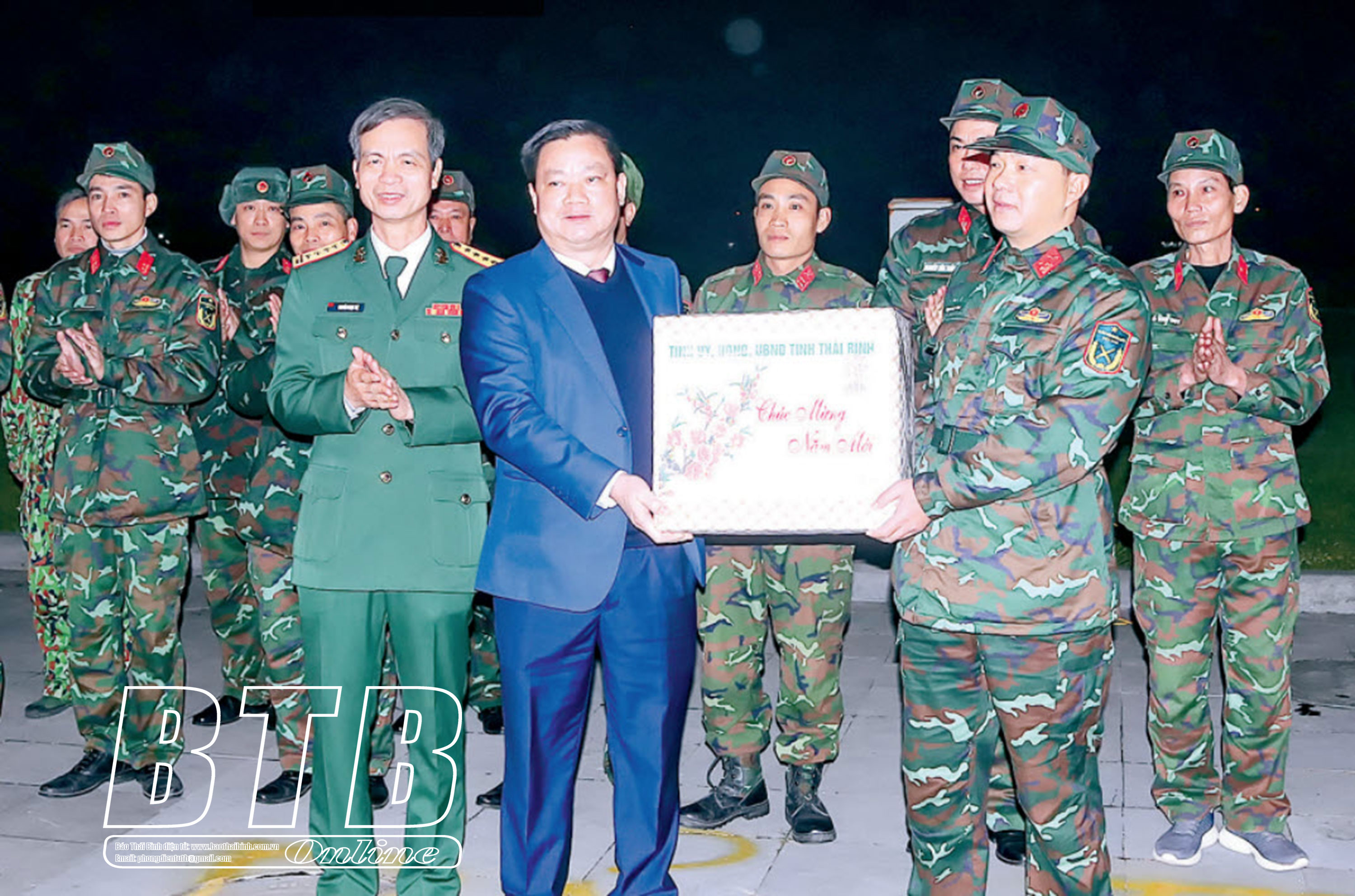 Đồng chí Nguyễn Khắc Thận, Phó Bí thư Tỉnh ủy, Chủ tịch UBND tỉnh tặng quà, chúc tết cán bộ, chiến sĩ làm nhiệm vụ tại trận địa pháo hoa đêm giao thừa tại Quảng trường Bác Hồ với nông dân Việt Nam.