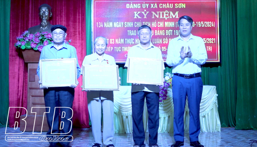 Lãnh đạo huyện Quỳnh Phụ trao Huy hiệu Đảng cho các đảng viên cao tuổi đảng xã Châu Sơn.