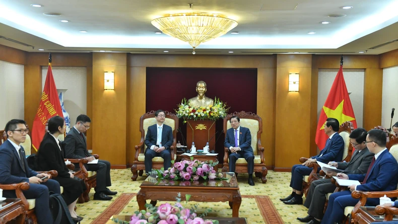 Đoàn đại biểu cấp cao của Ủy ban Chống tham nhũng và Quyền công dân Hàn Quốc hội kiến đồng chí Phan Đình Trạc. (Ảnh: Đăng Khoa).