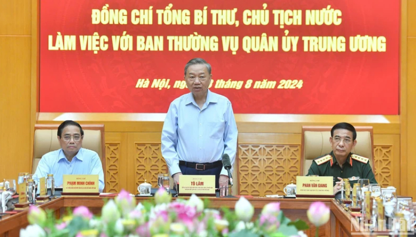 Tổng Bí thư, Chủ tịch nước Tô Lâm nhấn mạnh, phải đặc biệt chăm lo xây dựng Quân đội vững mạnh về chính trị, Đảng bộ Quân đội thật sự trong sạch, vững mạnh, gương mẫu, tiêu biểu cả về chính trị, tư tưởng, đạo đức, tổ chức và cán bộ; giữ vững và tăng cường sự lãnh đạo tuyệt đối, trực tiếp về mọi mặt của Đảng đối với Quân đội.