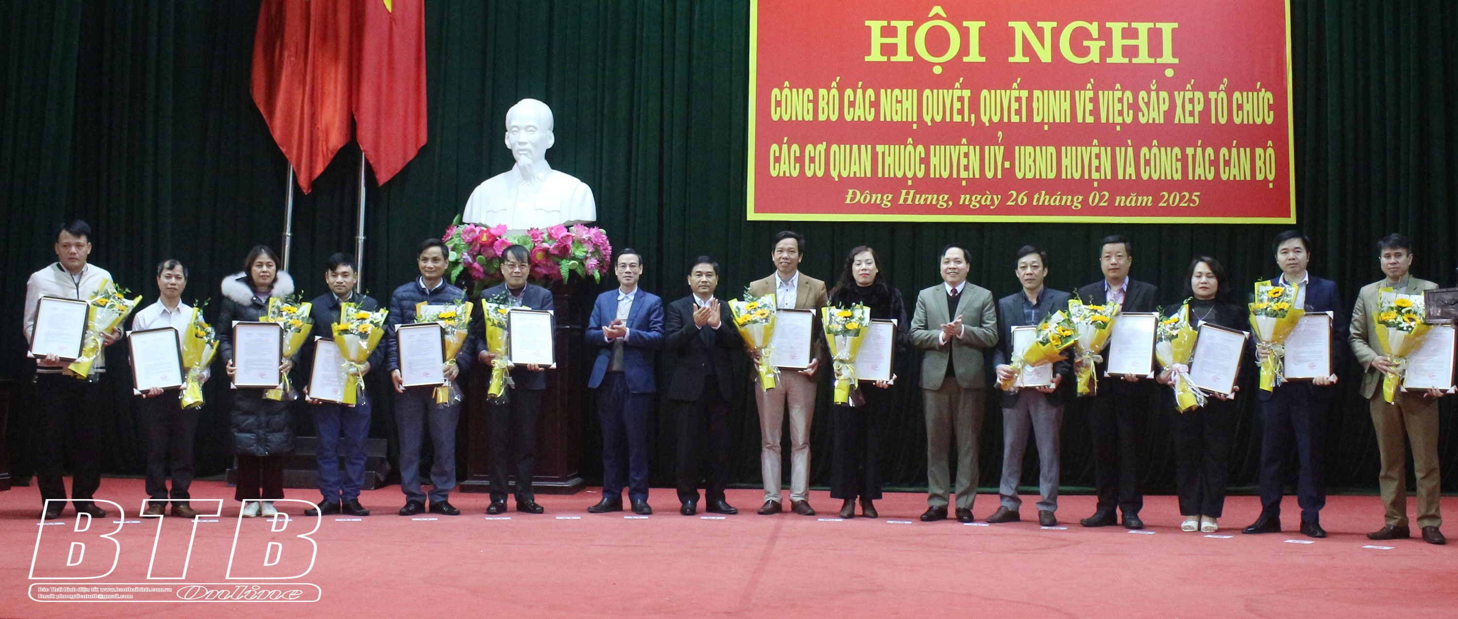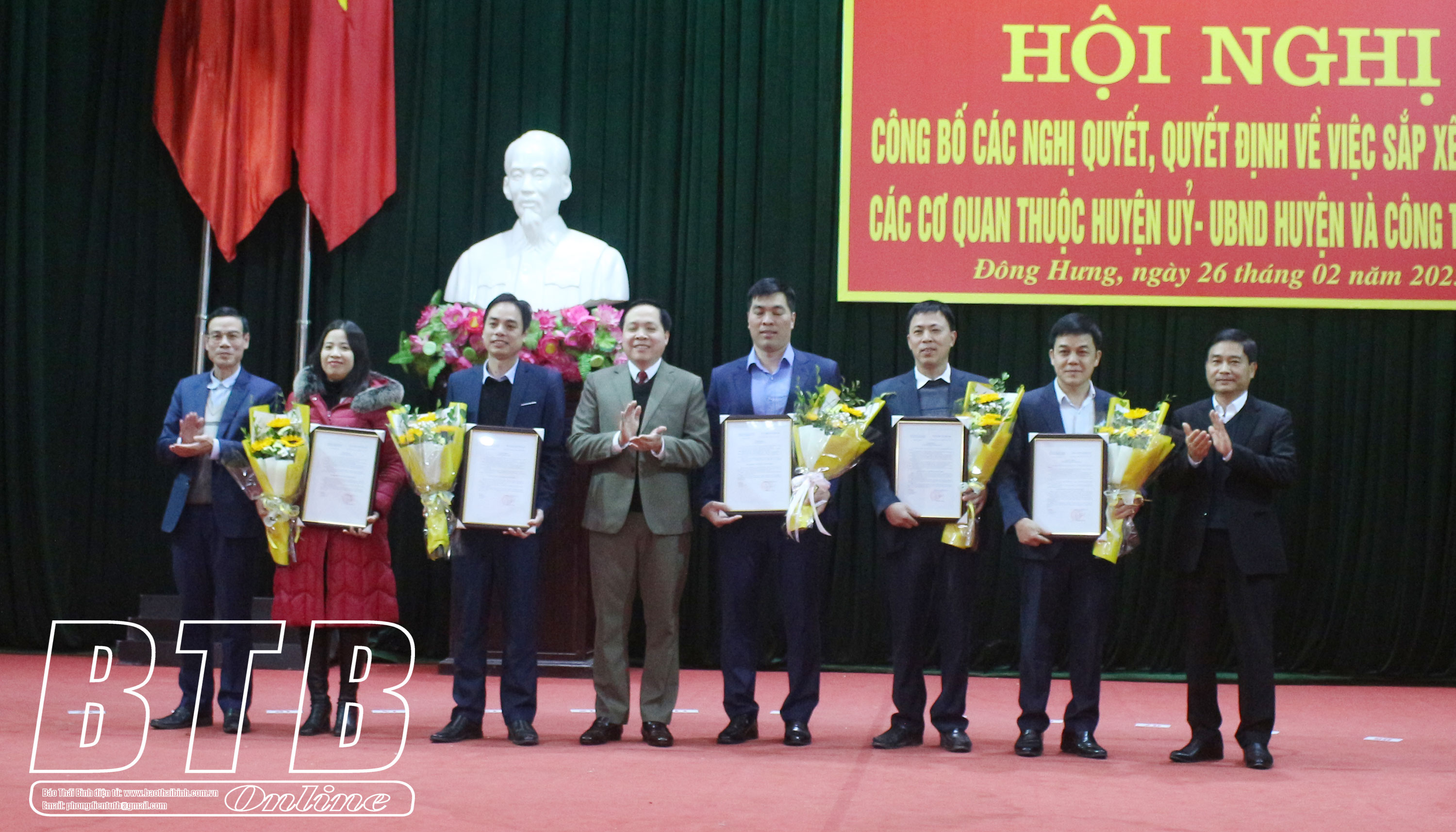 Tại hội nghị đã công bố thông báo của Ban Chấp hành Đảng bộ huyện, Ban Thường vụ Huyện ủy về việc phân công công tác đối với một số đồng chí Ủy viên Ban Thường vụ Huyện ủy, nhiệm kỳ 2020 - 2025; Nghị quyết của HĐND huyện về việc thành lập 5 cơ quan chuyên môn thuộc UBND huyện; công bố quyết định của Huyện ủy Đông Hưng về việc hợp nhất Ban Tuyên giáo Huyện ủy và Ban Dân vận Huyện ủy thành Ban Tuyên giáo và Dân vận Huyện ủy; công bố các quyết định của Huyện ủy Đông Hưng về việc phân công, bổ nhiệm cán bộ thuộc Ban Tuyên giáo và Dân vận Huyện ủy, Ban Tổ chức Huyện ủy và Ủy ban Kiểm tra Huyện ủy; đồng thời công bố các quyết định của UBND huyện Đông Hưng về việc điều động, bổ nhiệm chức vụ lãnh đạo quản lý gồm: Chánh Văn phòng, Phó Chánh Văn phòng HĐND và UBND huyện; Trưởng phòng, Phó Trưởng phòng các phòng: Nội vụ; Nông nghiệp và Môi trường; Kinh tế, Hạ tầng và Đô thị; Văn hóa, Khoa học và Thông tin.