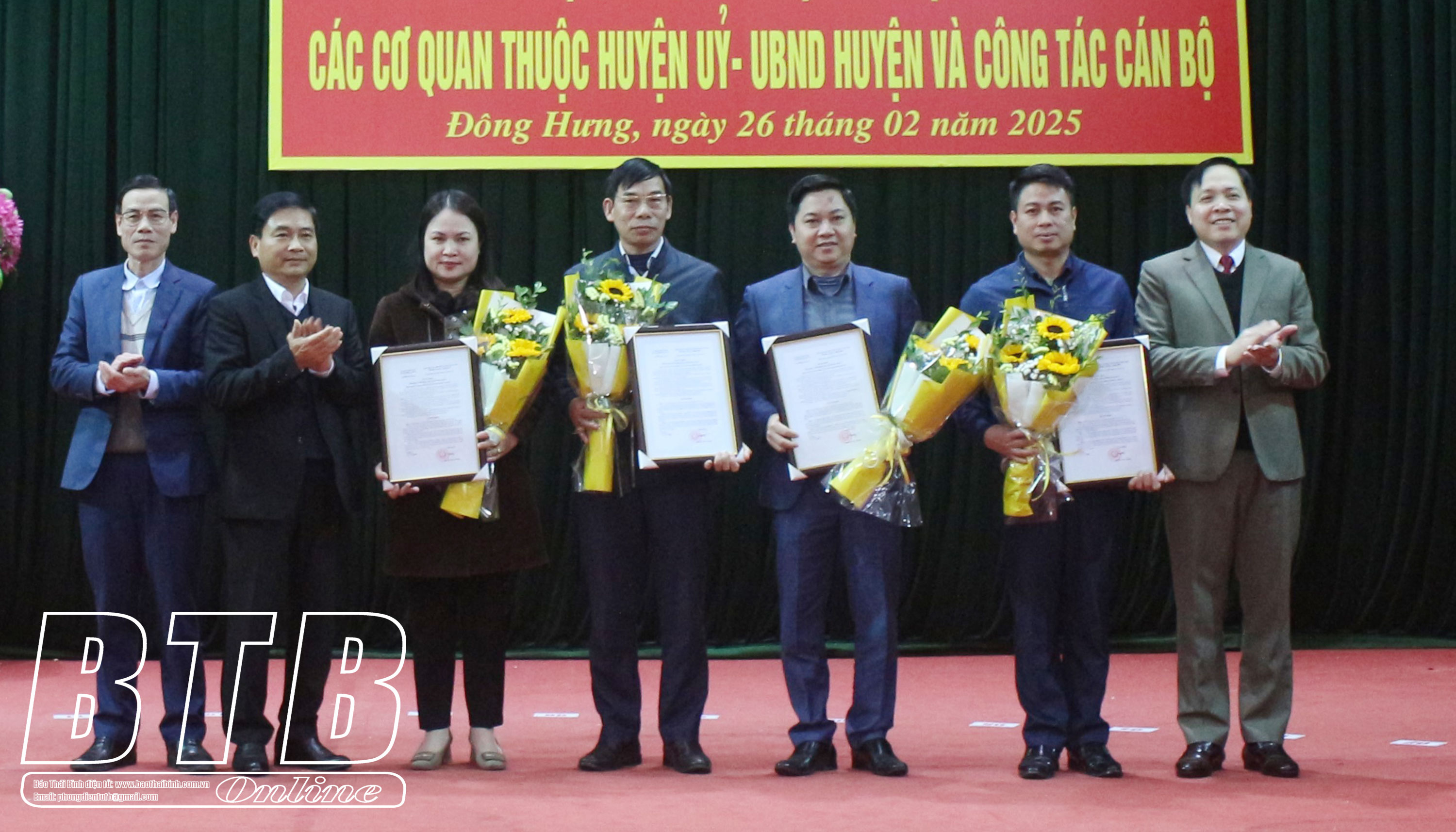 Các đồng chí lãnh đạo huyện Đông Hưng trao quyết định của UBND huyện và tặng hoa chúc mừng cho các cán bộ được điều động, bổ nhiệm.