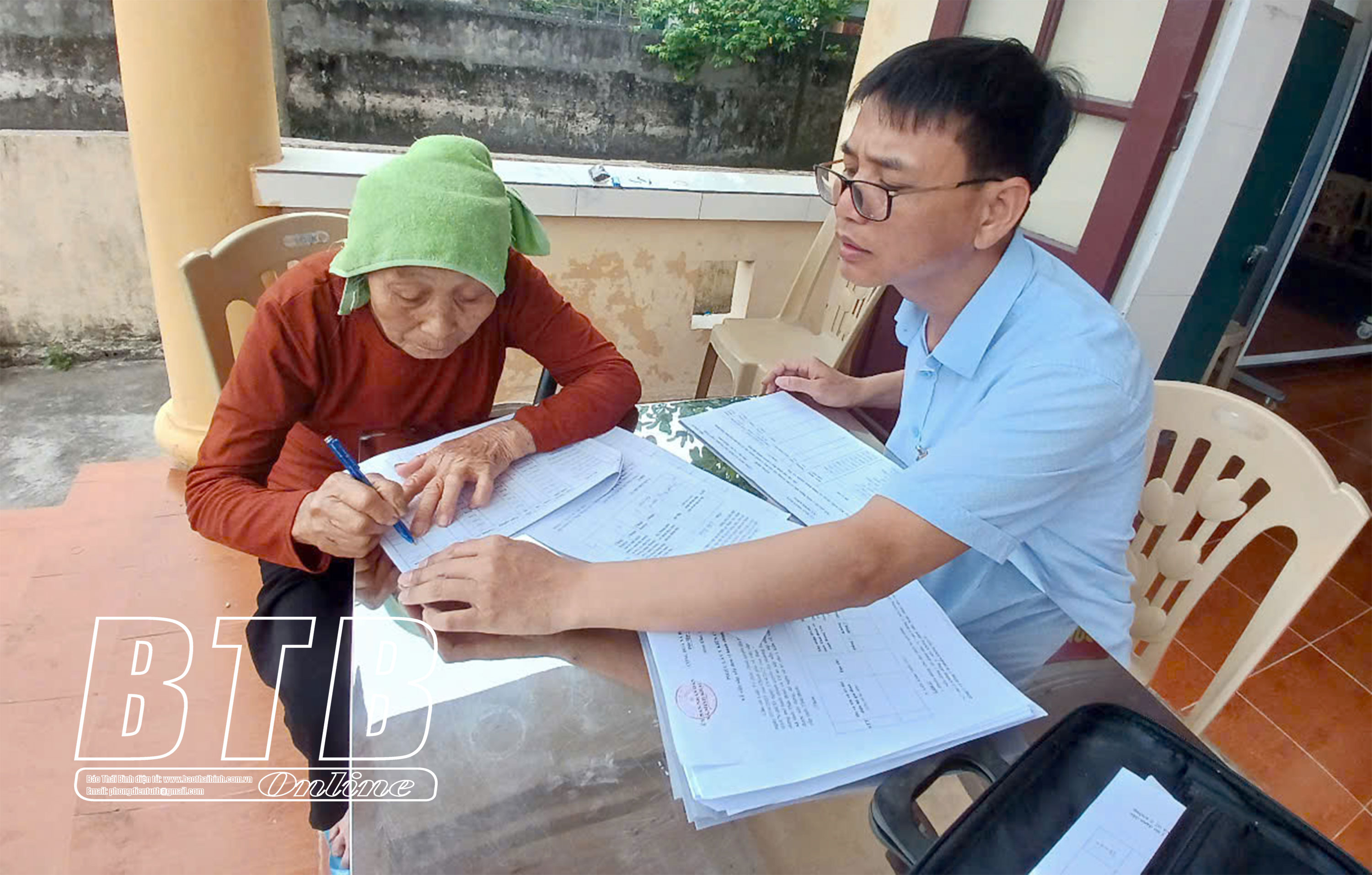 Thành viên Tổ lấy ý kiến nhân dân thôn Khê Kiều, xã Minh Khai hướng dẫn người dân cách ghi phiếu lấy ý kiến.