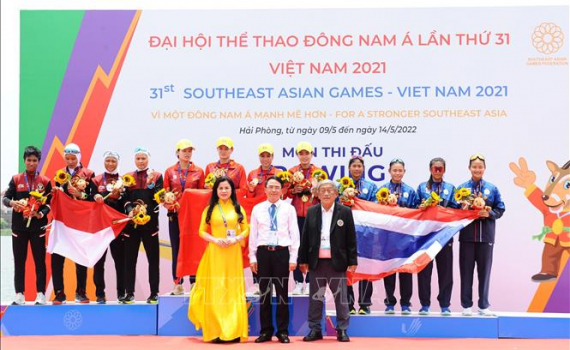 Ban tổ chức trao HCV cho các đội nội dung thuyền 4 nữ hạng nặng chèo đơn, gồm: Việt Nam (giữa - HCV), Indonesia (trái - HCB) và Thái Lan (phải - HCĐ).