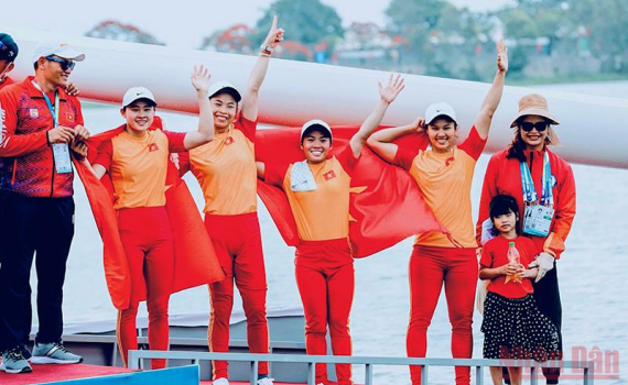 Các vận động viên nữ Việt Nam xuất sắc về nhất nội dung thuyền 4 nữ Canoeing 1000m, đoạt Huy chương Vàng.