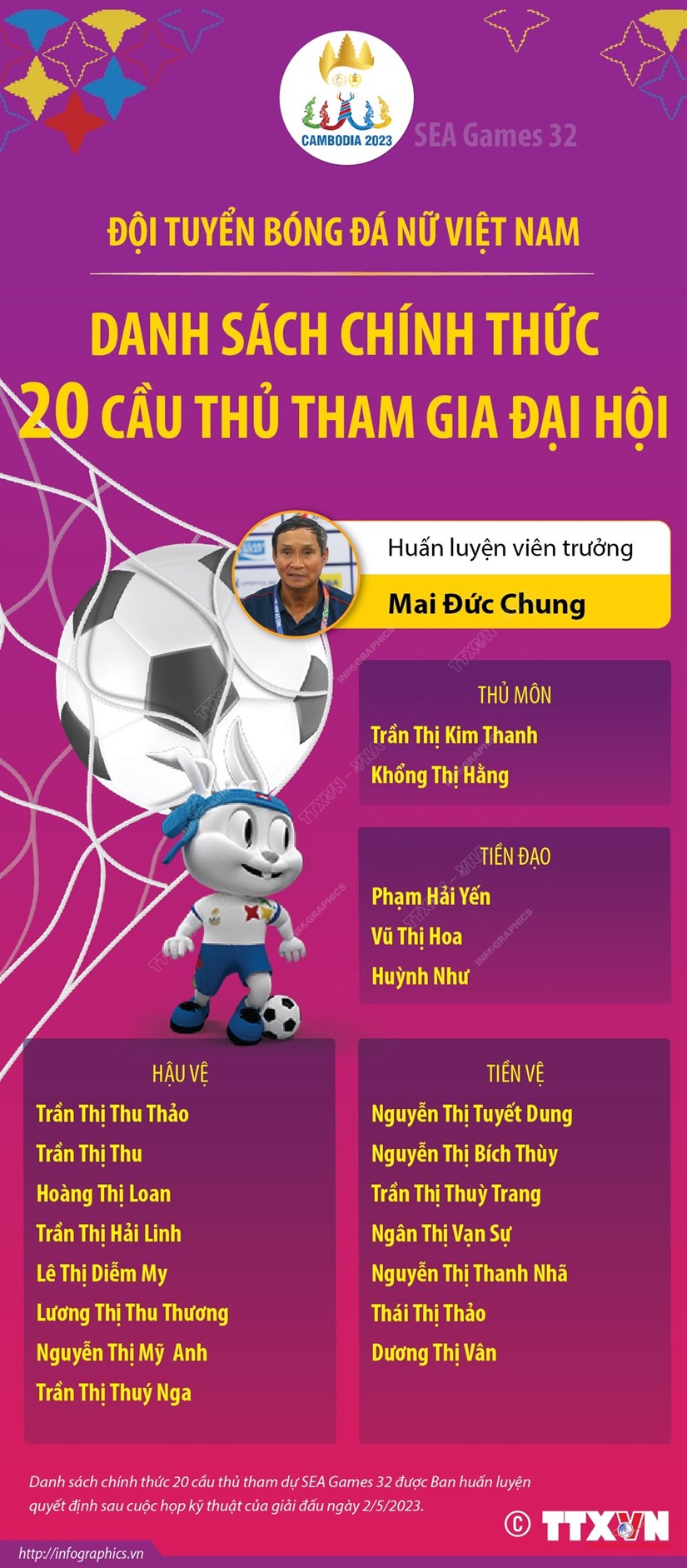 Chiều 2/5, huấn luyện viên trưởng Mai Đức Chung đã chính thức chốt danh sách 20 cầu thủ đội tuyển nữ Việt Nam tham dự SEA Games 32 tại Campuchia.