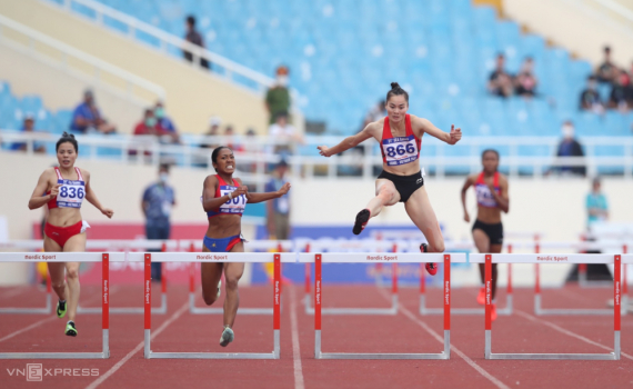 Quách Thị Lan (nhảy trên rào), khi về nhất nội dung 400m rào nữ tại SEA Games 31 trên sân Mỹ Đình, Hà Nội chiều 17/5/2022.