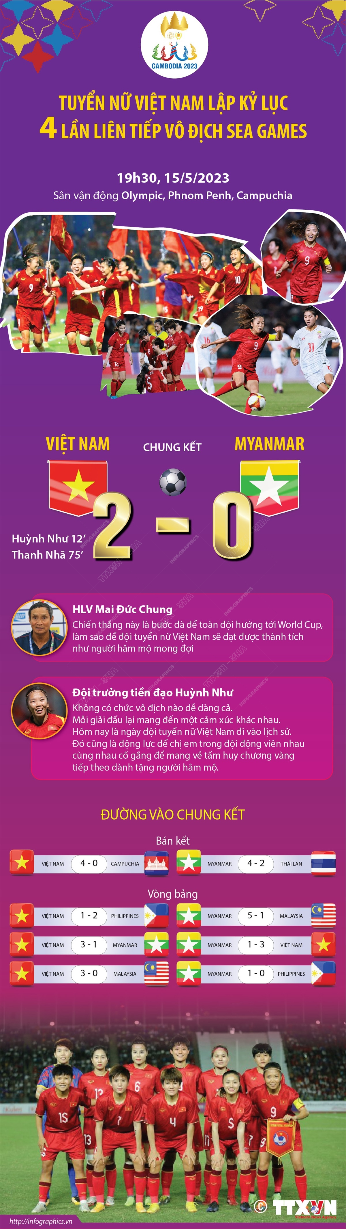 Các bàn thắng của Huỳnh Như, Thanh Nhã giúp tuyển nữ Việt Nam đánh bại Myanmar 2-0 để giành chức vô địch SEA Games lần thứ 8 và là lần thứ 4 liên tiếp.
