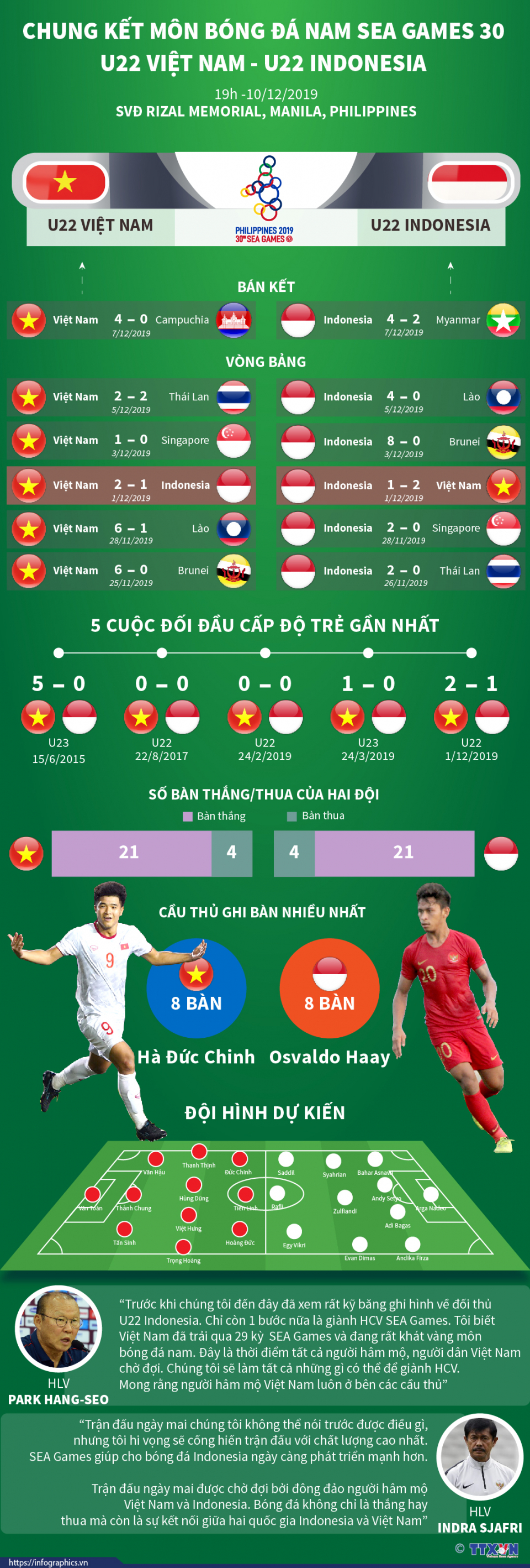 Trận đấu giữa U22 Việt Nam và U22 Indonesia sẽ được diễn ra vào lúc 19h ngày 10/12/2019 trên Sân vận động Rizal Memorial, Manila, Philippines.
